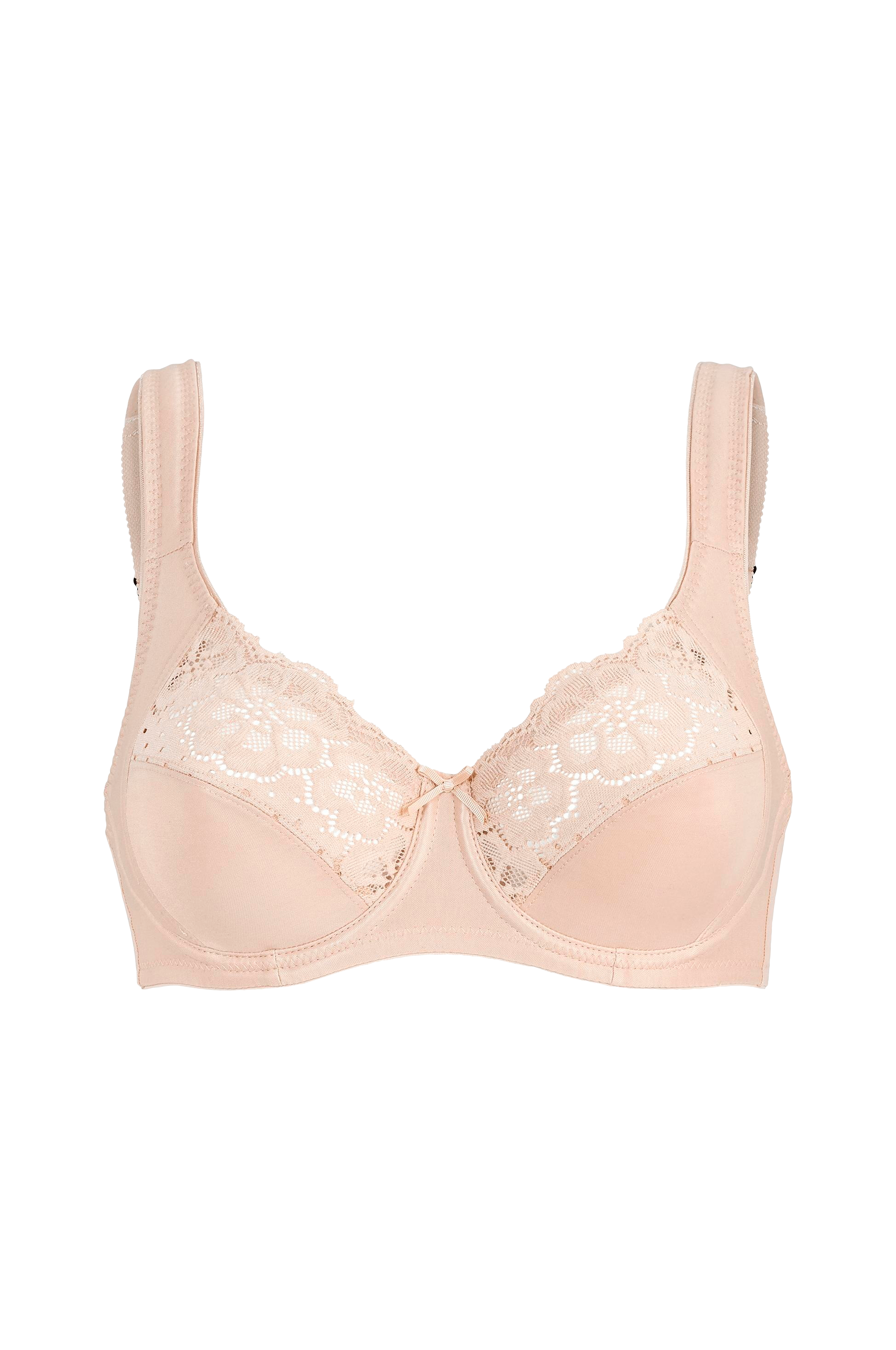 Bøjle-bh lavet af økologisk cotton, med en smuk blonde, der pryder skålen. Bh'en er udstyret med vores komfortbøjle, en lidt større og højere bøjle, som hjælper med at indfange og støtte din barm. Den har også justerbare, polstrede skulderstropper, som aflaster dine skuldre og giver den bedste komfort. Cotton bloom bøjle-bh har en polstret sidestøtte, som centrerer og former barmen, og en bredere ryg, som giver ekstra støtte. Polstrede hægter gør bh'en blød og behagelig mod ryggen.