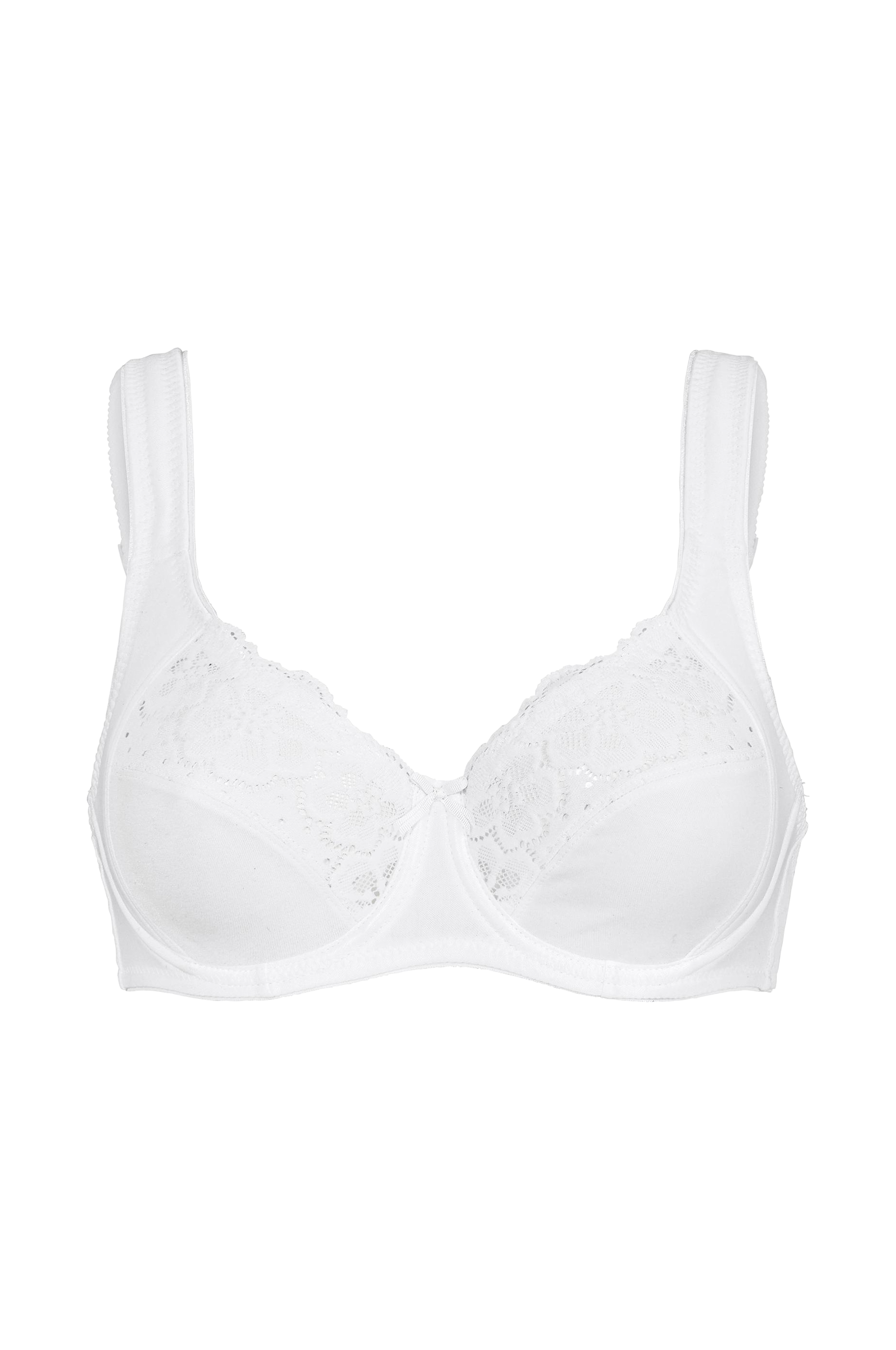 Bøjle-bh lavet af økologisk cotton, med en smuk blonde, der pryder skålen. Bh'en er udstyret med vores komfortbøjle, en lidt større og højere bøjle, som hjælper med at indfange og støtte din barm. Den har også justerbare, polstrede skulderstropper, som aflaster dine skuldre og giver den bedste komfort. Cotton bloom bøjle-bh har en polstret sidestøtte, som centrerer og former barmen, og en bredere ryg, som giver ekstra støtte. Polstrede hægter gør bh'en blød og behagelig mod ryggen.