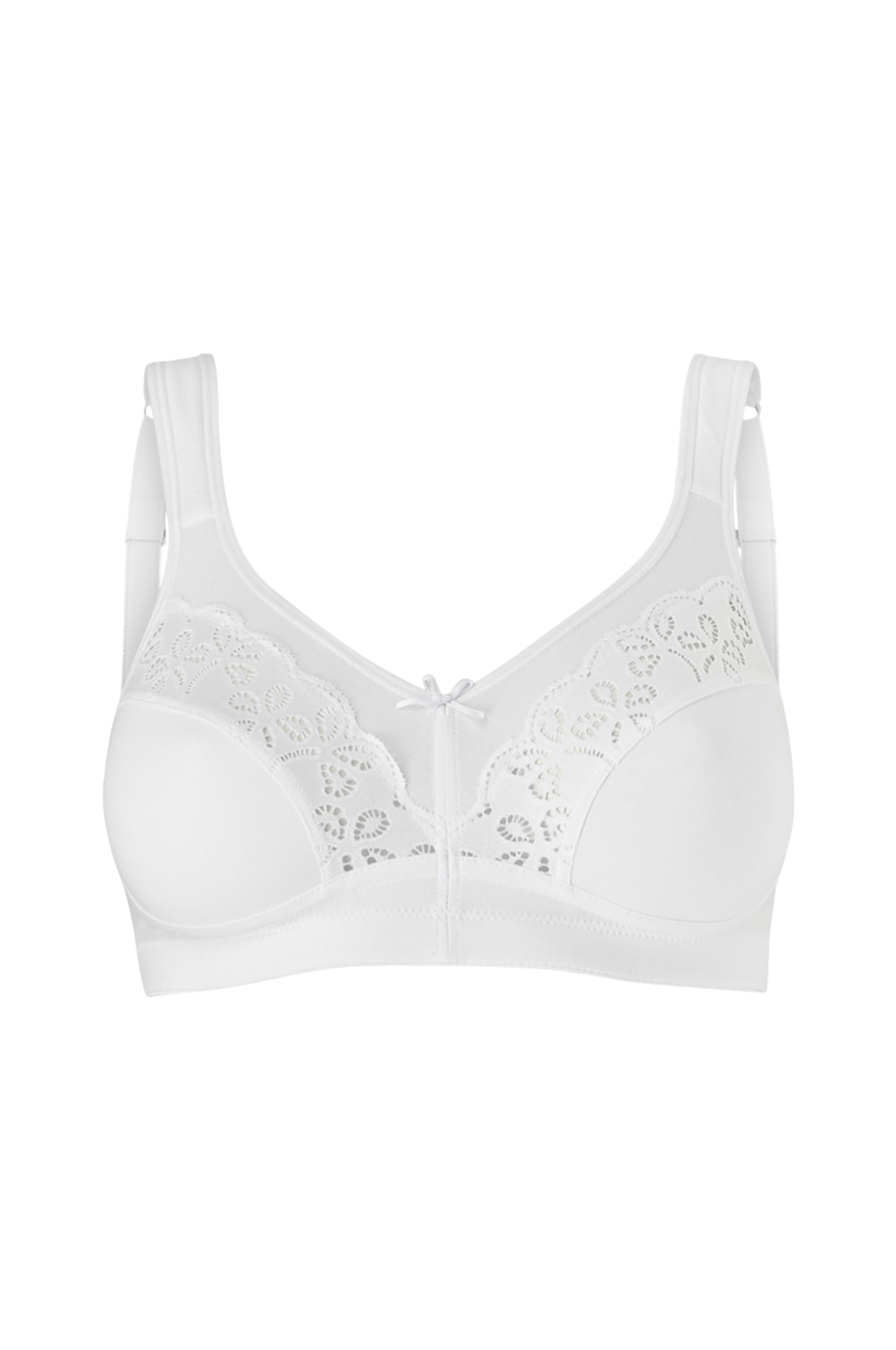 Blød bh Treasure fra Swegmark. Skøn model i dobbeltlag bomuld med fin blonde foroven på skålene. Høj bagpå og brede, vatterede skulderstropper.