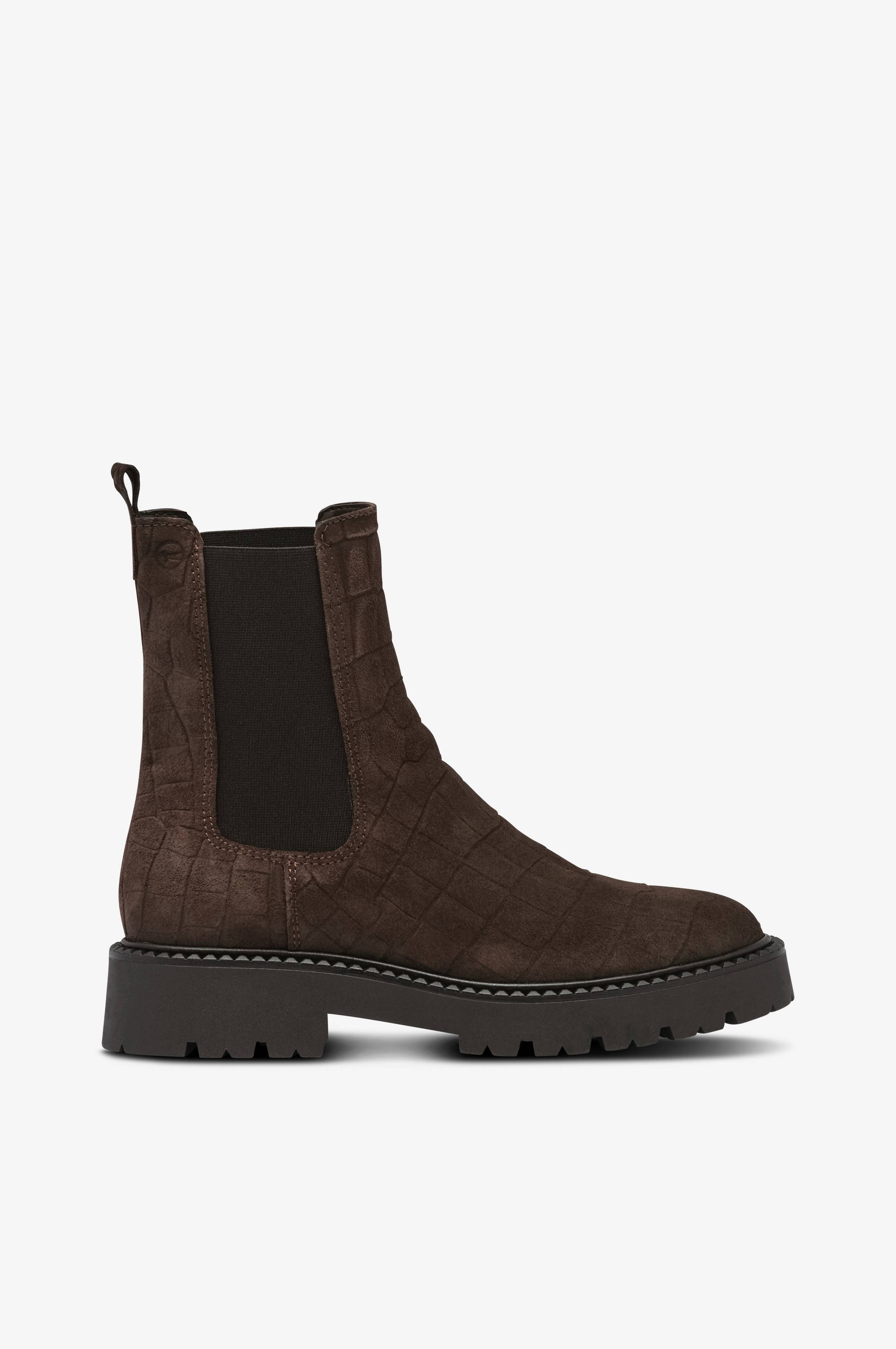 • Boots i ruskind• Elastiske paneler på begge sider af skaftet• Trækstrop bag på skaftet• Inderfor i tekstil• Blød polstret indersål• Grovmønstret ydersål i gummi• Skafthøjde: 16,5 cm i str. 37