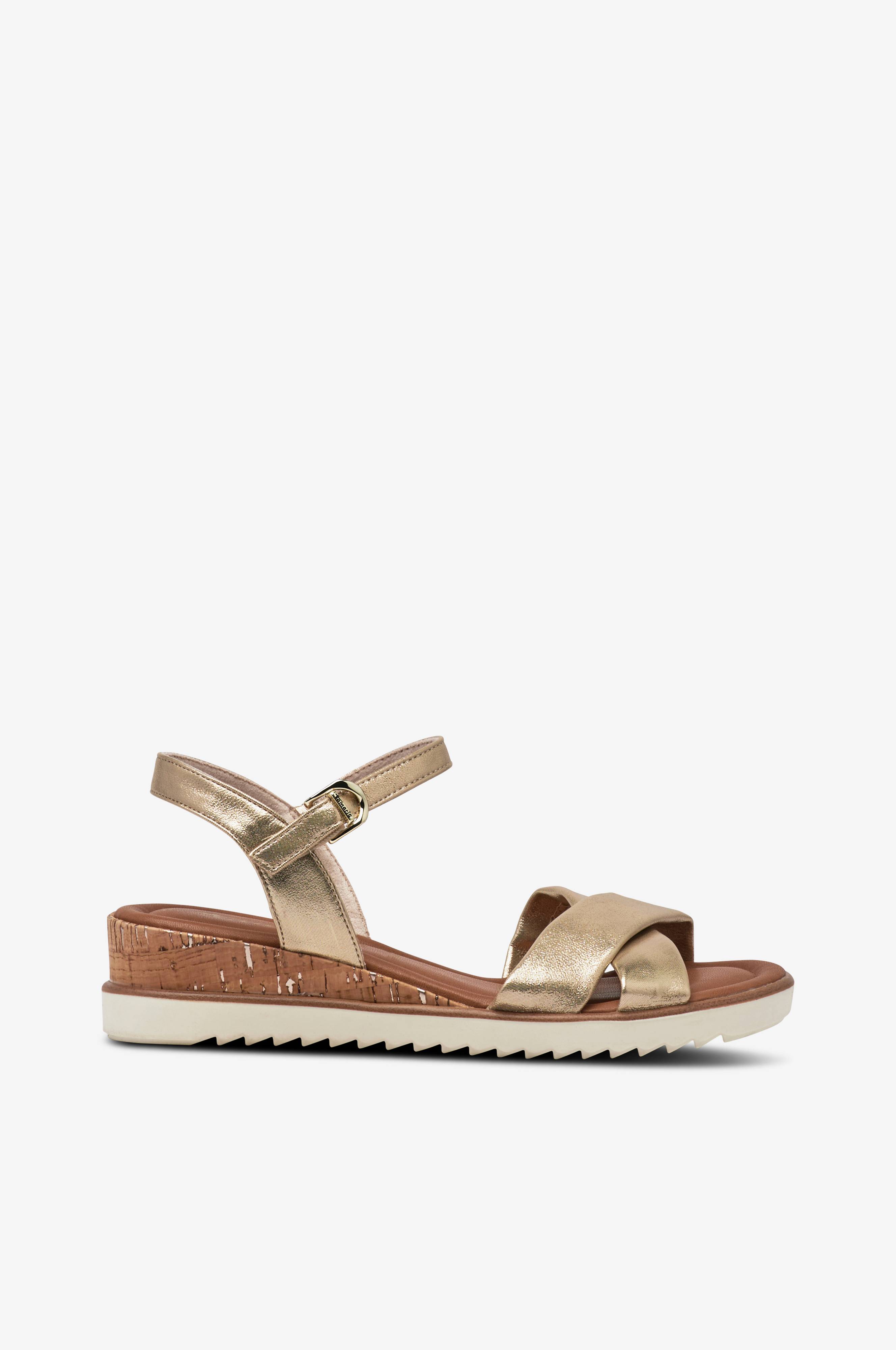 • Guldfarvet model i imiteret læder• Krydsende remme over foden• Justérbar rem omkring anklen med elastisk Vedhæftning• Wedgehæl i kork• Riflet sål• Blød polstret indersål• Hælhøjde: 4 cm