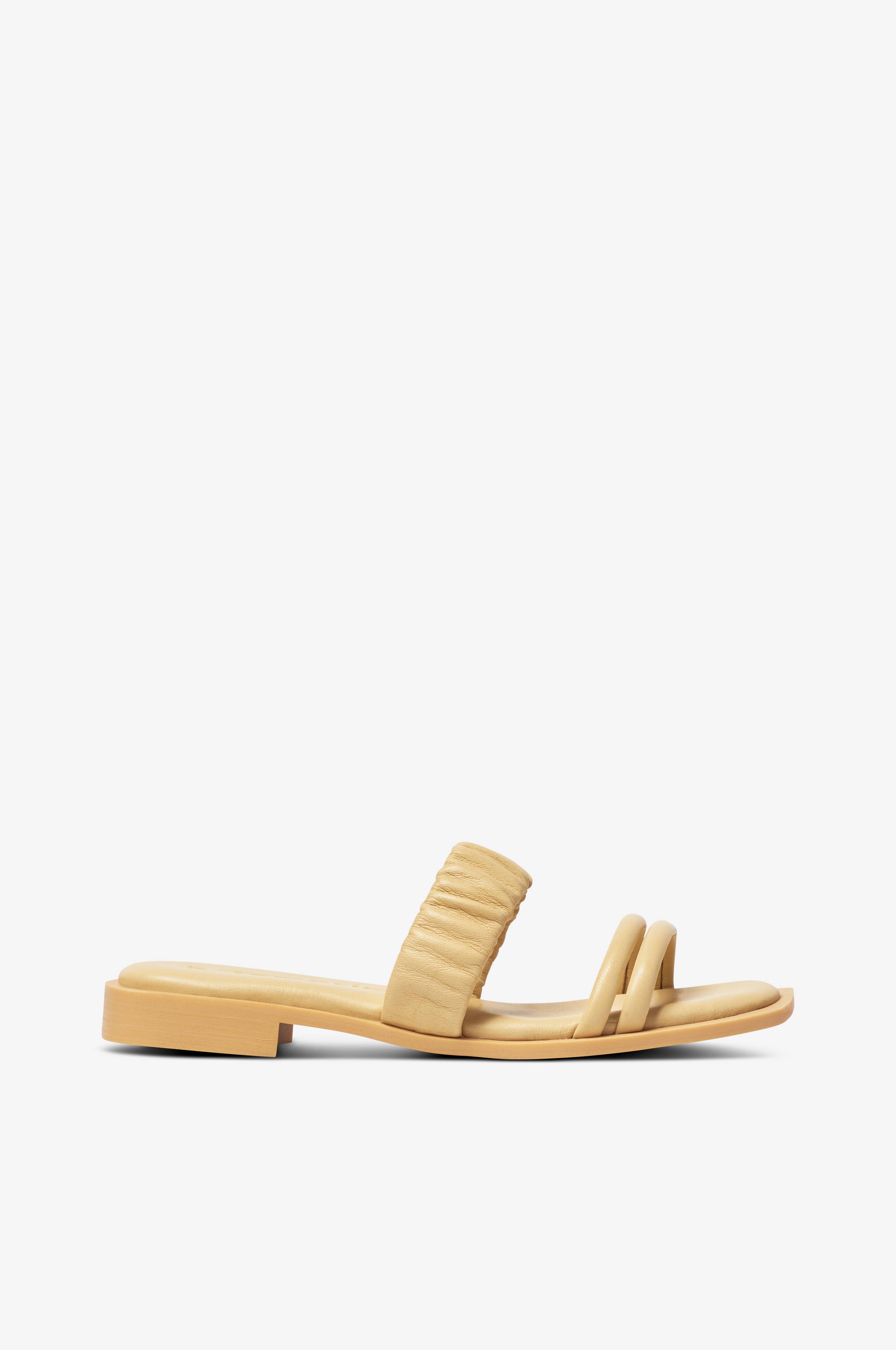 • Tynde remme ved tæerne• Elastisk rem over foden• Lav hæl• Fodseng i læder