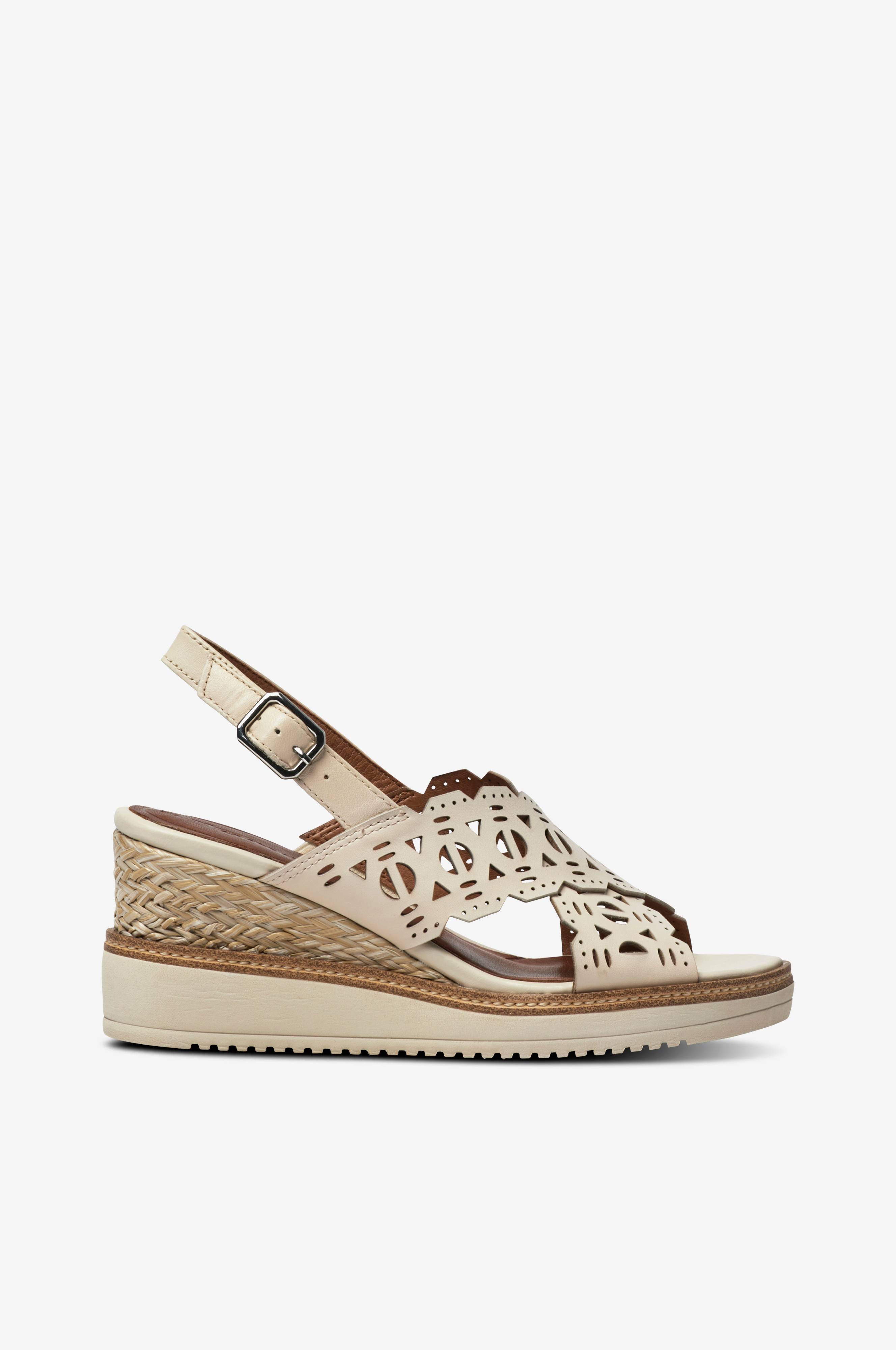 • Krydsende remme i læder med hulmønstre• Spænde ved anklen• Wedgehæl med anderledes strukturer• Hælhøjde: 7,5 cm