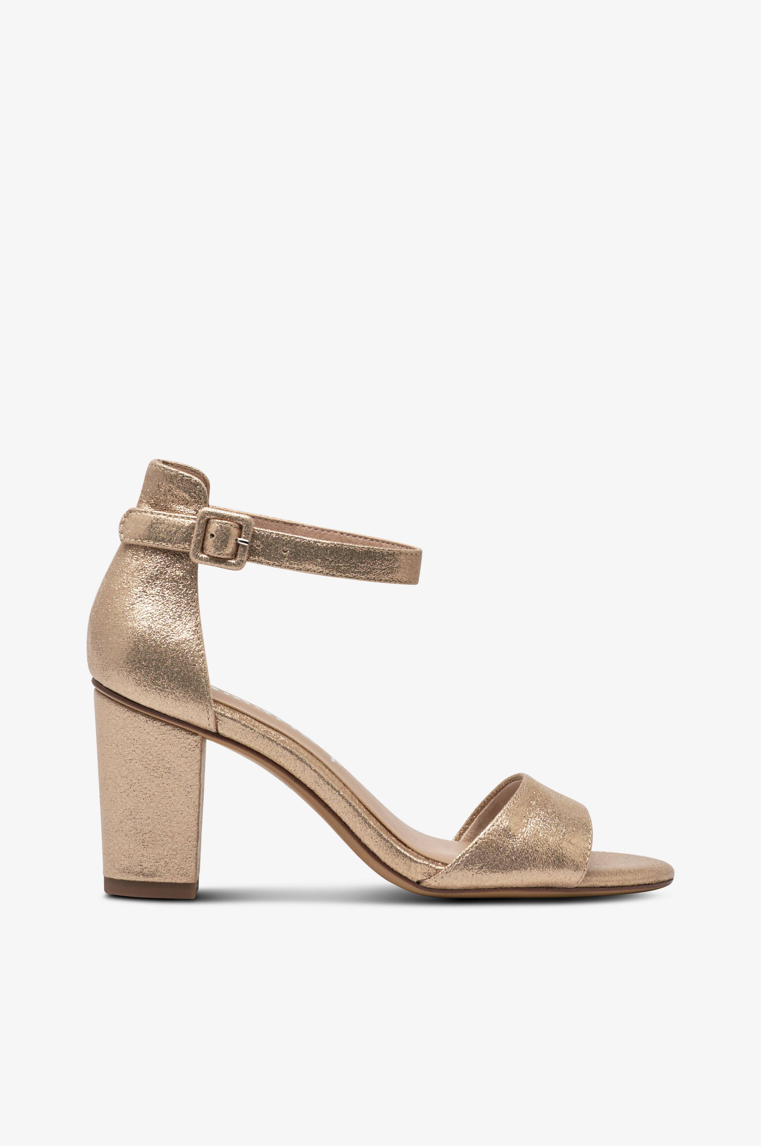 • Guldglitrende sandaler med hæl• Justérbar rem ved anklen• Beklædt hæl• Hælhøjde: 7,5 cm
