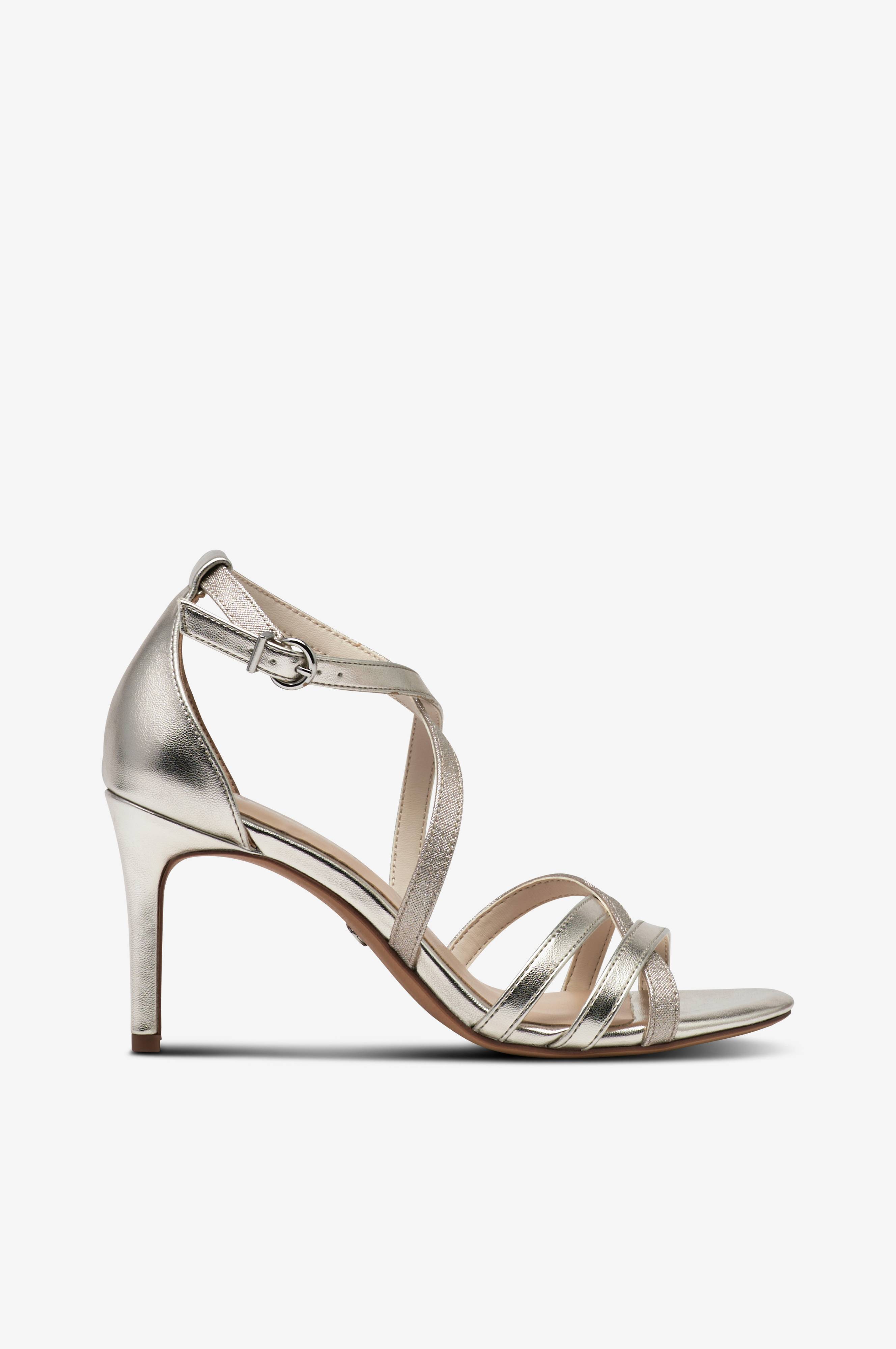 • Sølvfarvet model i imiteret læder med smalle remme• Afrundet snude• Justérbar ankelstrop med elastisk Vedhæftning• Høj, beklædt hæl• Blød polstret indersål• Hælhøjde: 8 cm