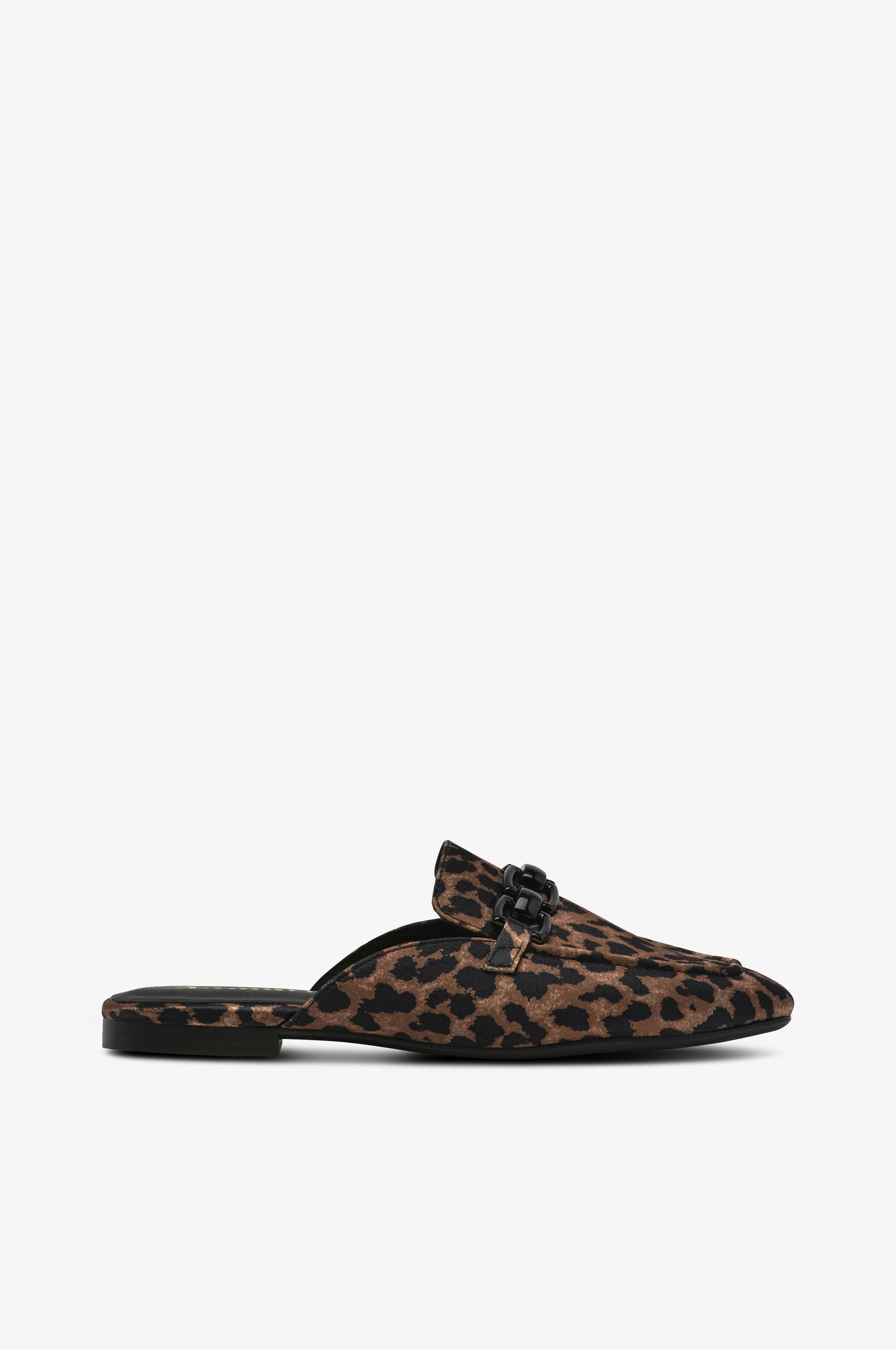 • Sandaler i leopardmønstret, skinnende tekstil• Detalje i sort metal over foden• Blød polstret indersål