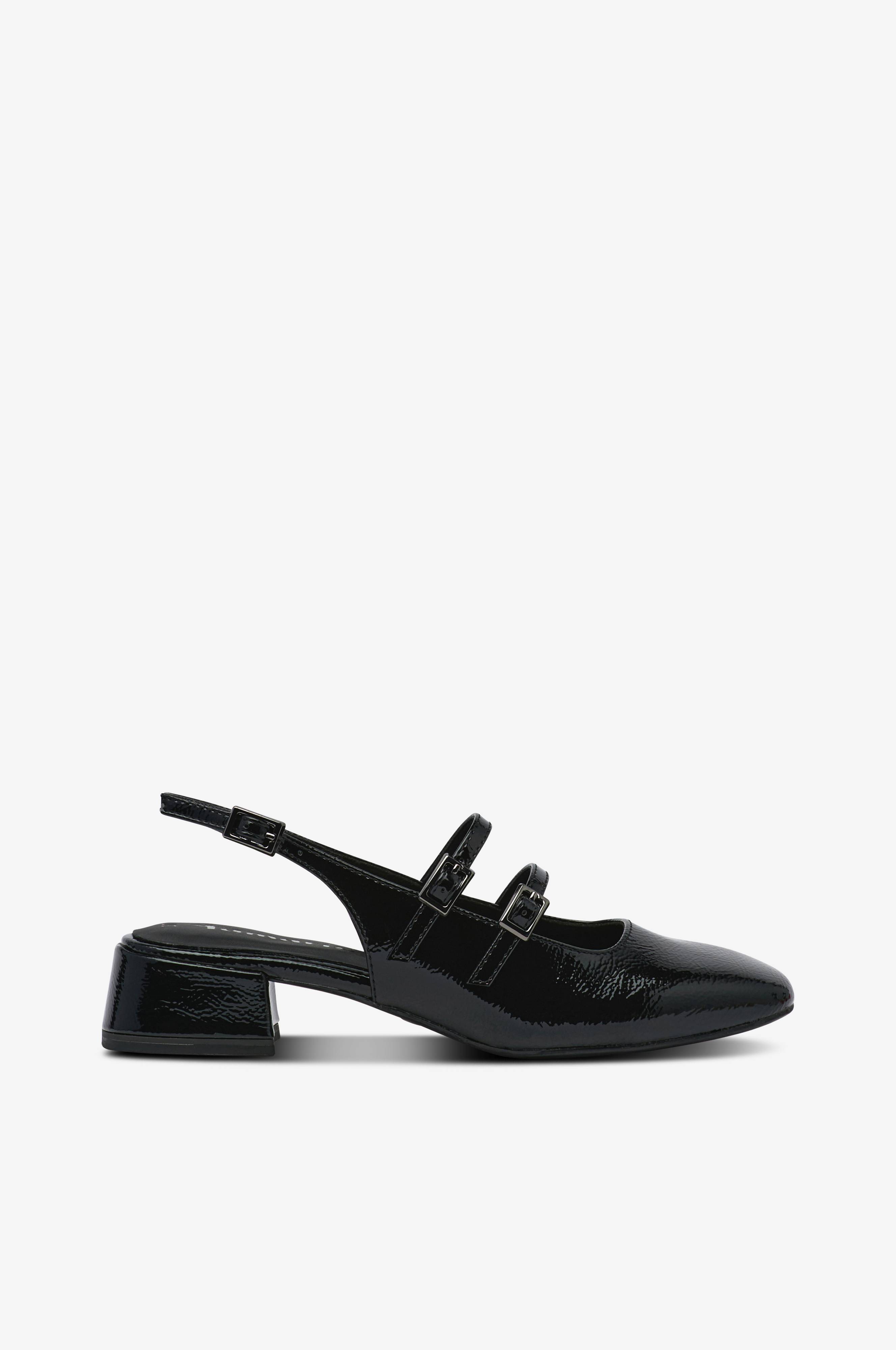 • Slingbacks i blankt, patent imiteret læder• To smalle, justérbare remme over foden• Justérbar ankelkæde• Beklædt blokhæl• Blød polstret, læderbetrukket indersål