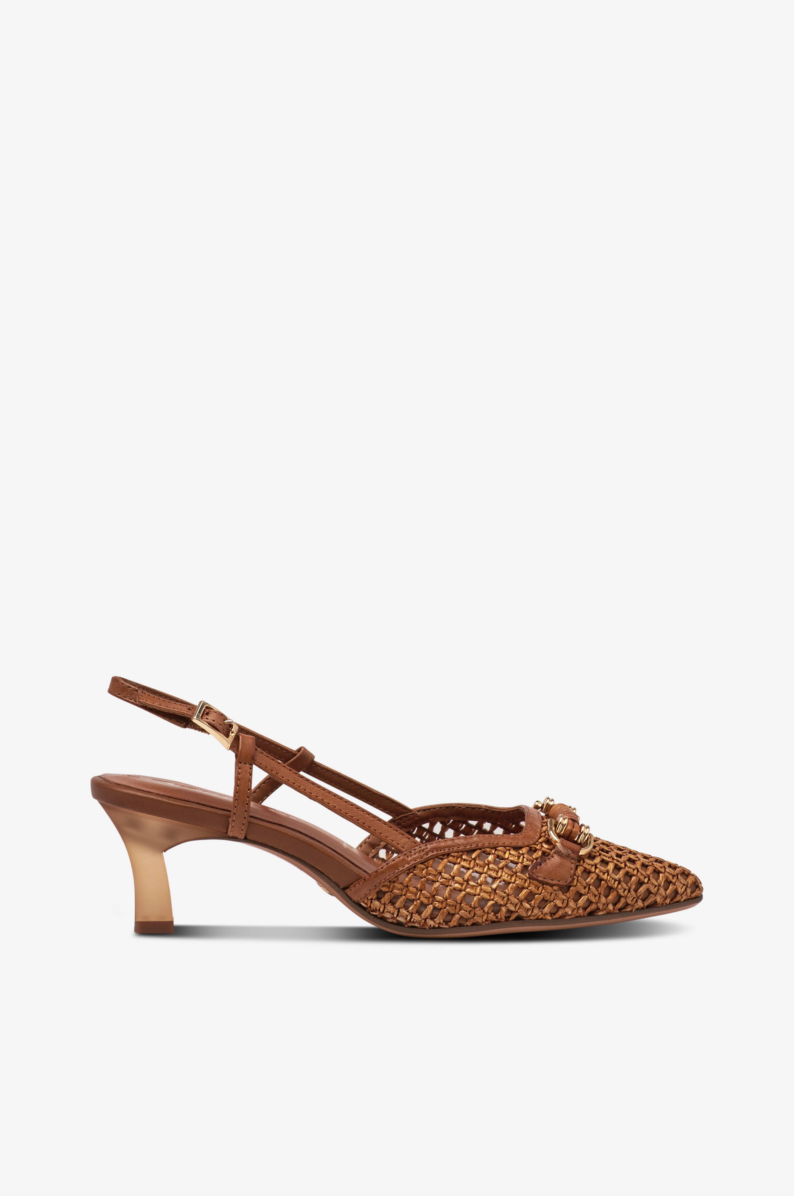 • Flettet model i læder• Spids snude med dekoration• Justérbar hælrem med elastisk Vedhæftning• Halvhøj, transparent hæl• Blød polstret indersål i læder• Hælhøjde: 6 cm
