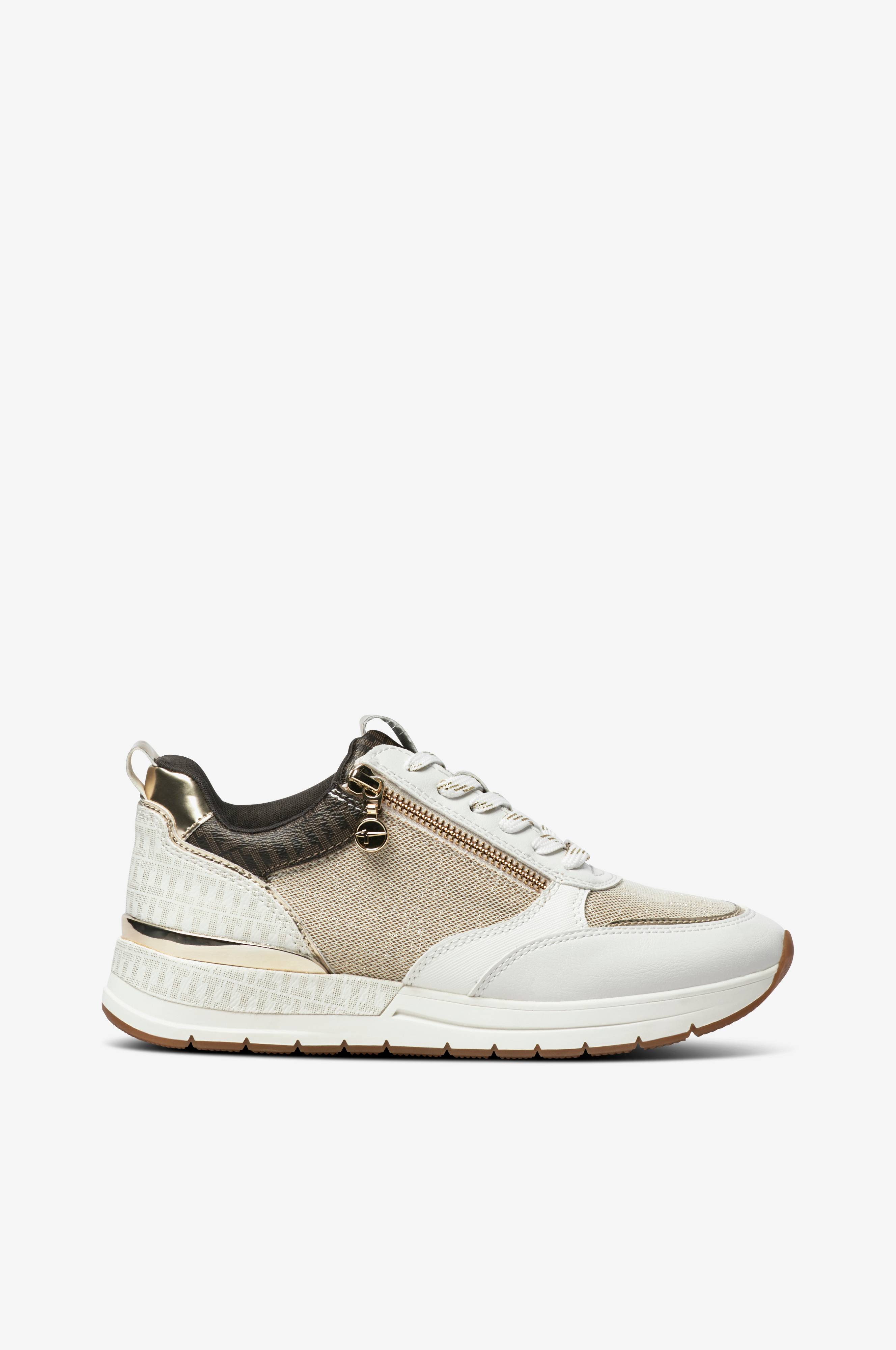 Sneakers med lynlås på ydersiden. Overdel af tekstil i en blanding af matte, blanke og glitrende materialer. Sølvfarvet detalje i syntet rundt om hælen. Tekstilfor. Udtagelig indersål og ydersål i gummi.