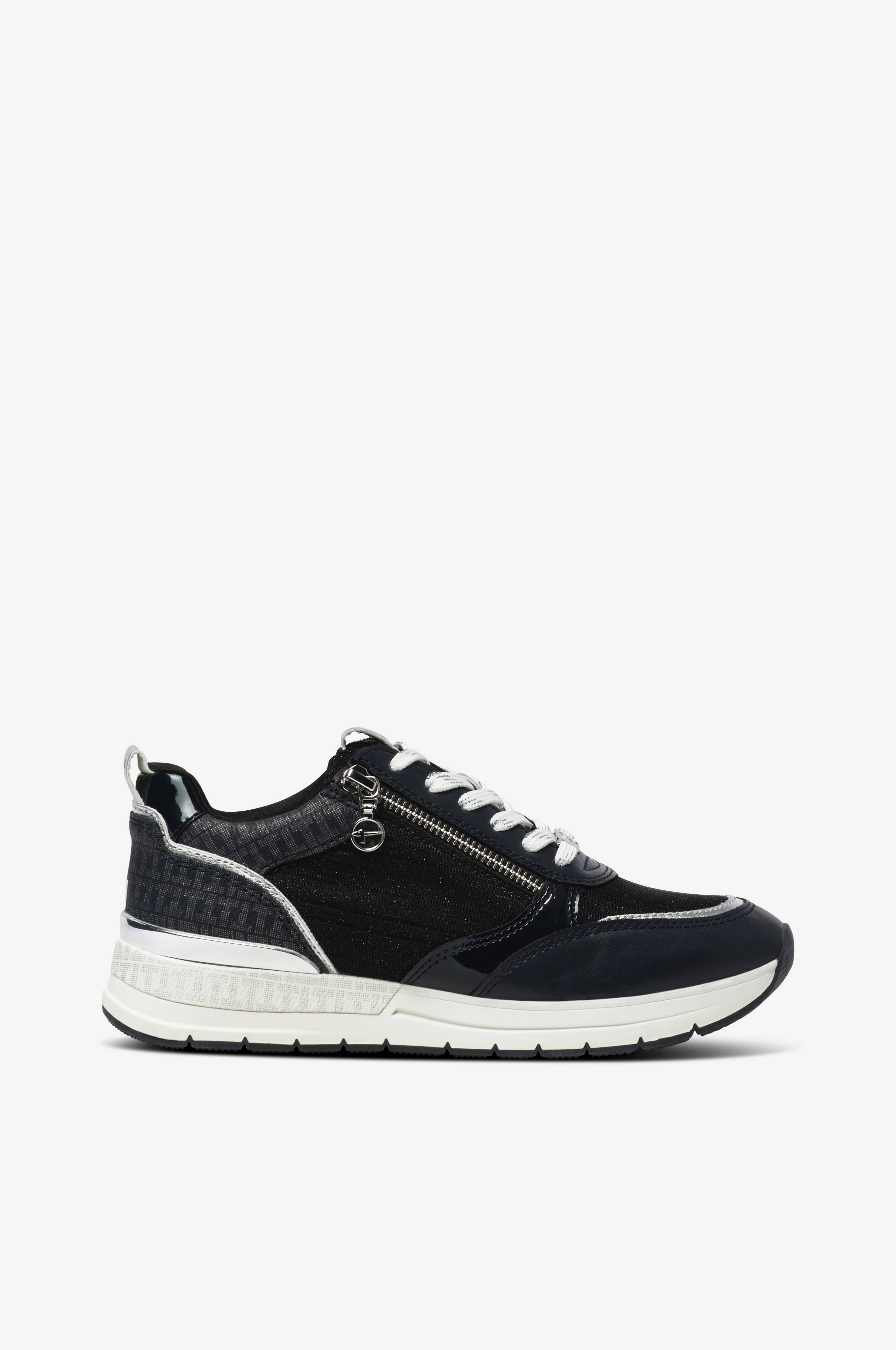 Sneakers med lynlås på ydersiden. Overdel af tekstil i en blanding af matte, blanke og glitrende materialer. Sølvfarvet detalje i syntet rundt om hælen. Tekstilfor. Udtagelig indersål. Ydersål i gummi.