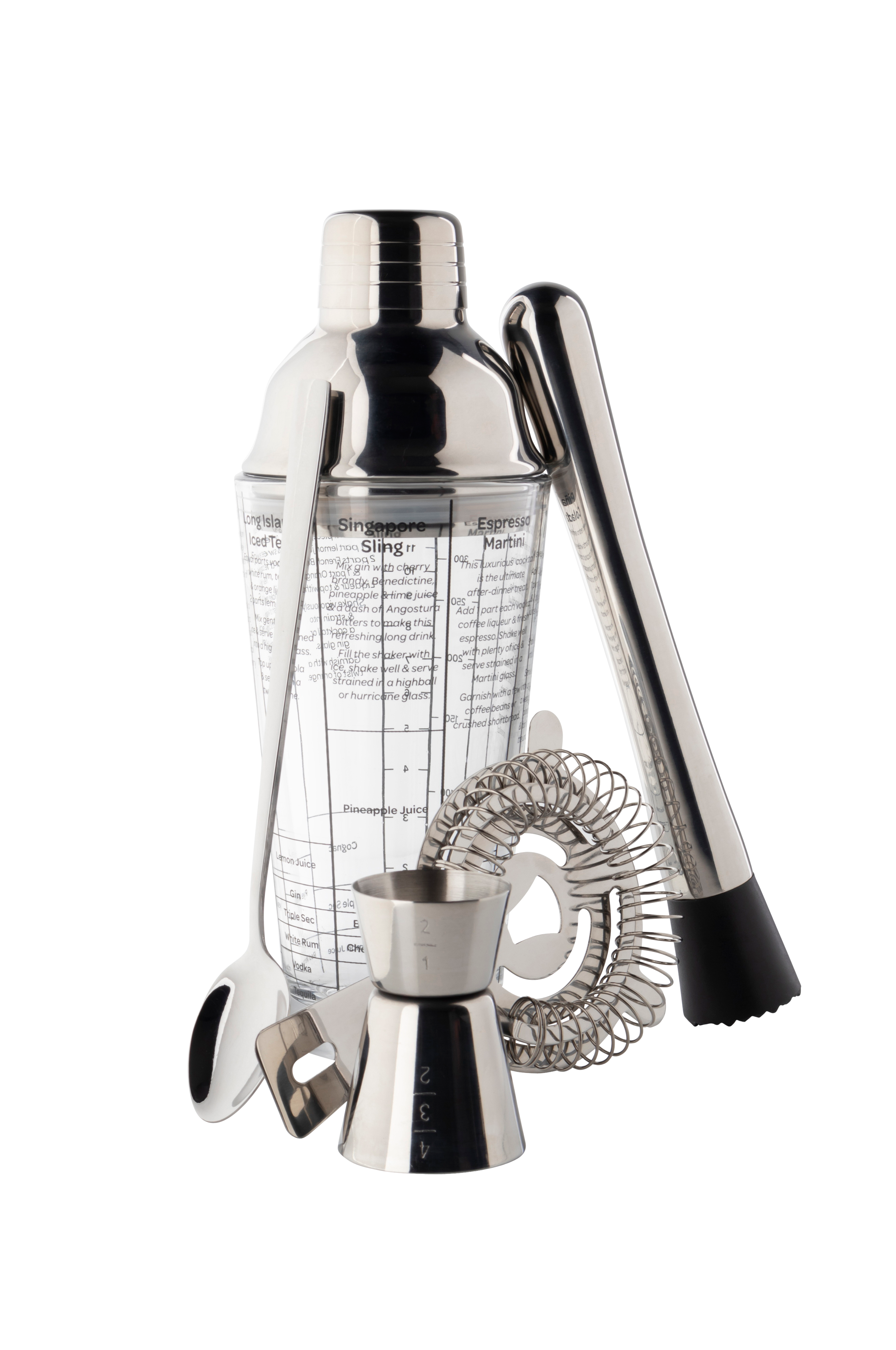 Alt hvad du behøver for at lave traditionelle shakede cocktails. Dette praktiske sæt til hjemmecocktailbaren indeholder en cobbler-cocktailshaker i glas med opskrifter, si, muddler, barske og dobbelt jigger.