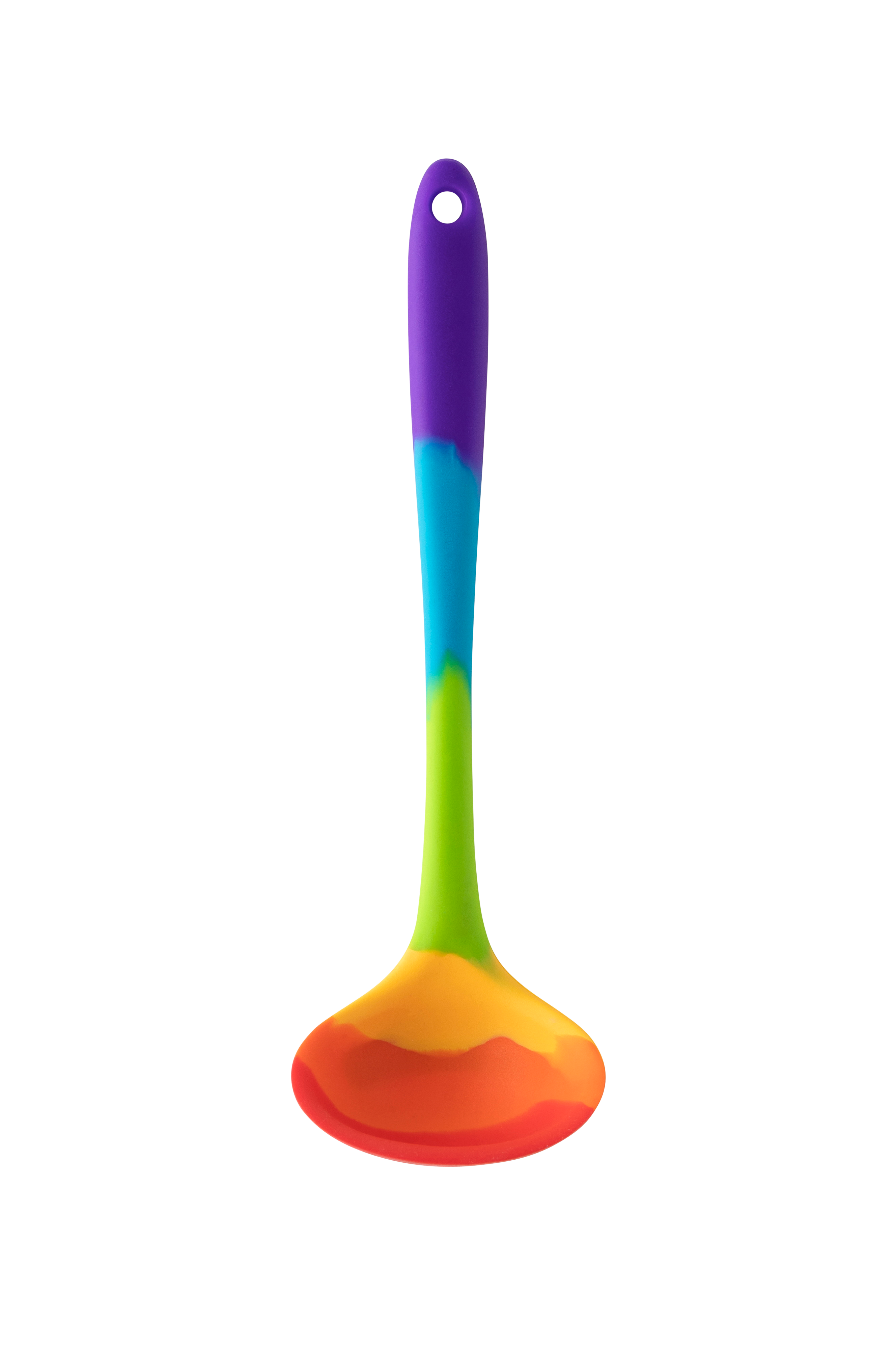 Silikonesuppeskeen er 21 cm lang og tåler opvaskemaskine. Taylors regnbue-silikoneøse leveres med producentens 5-års garanti.