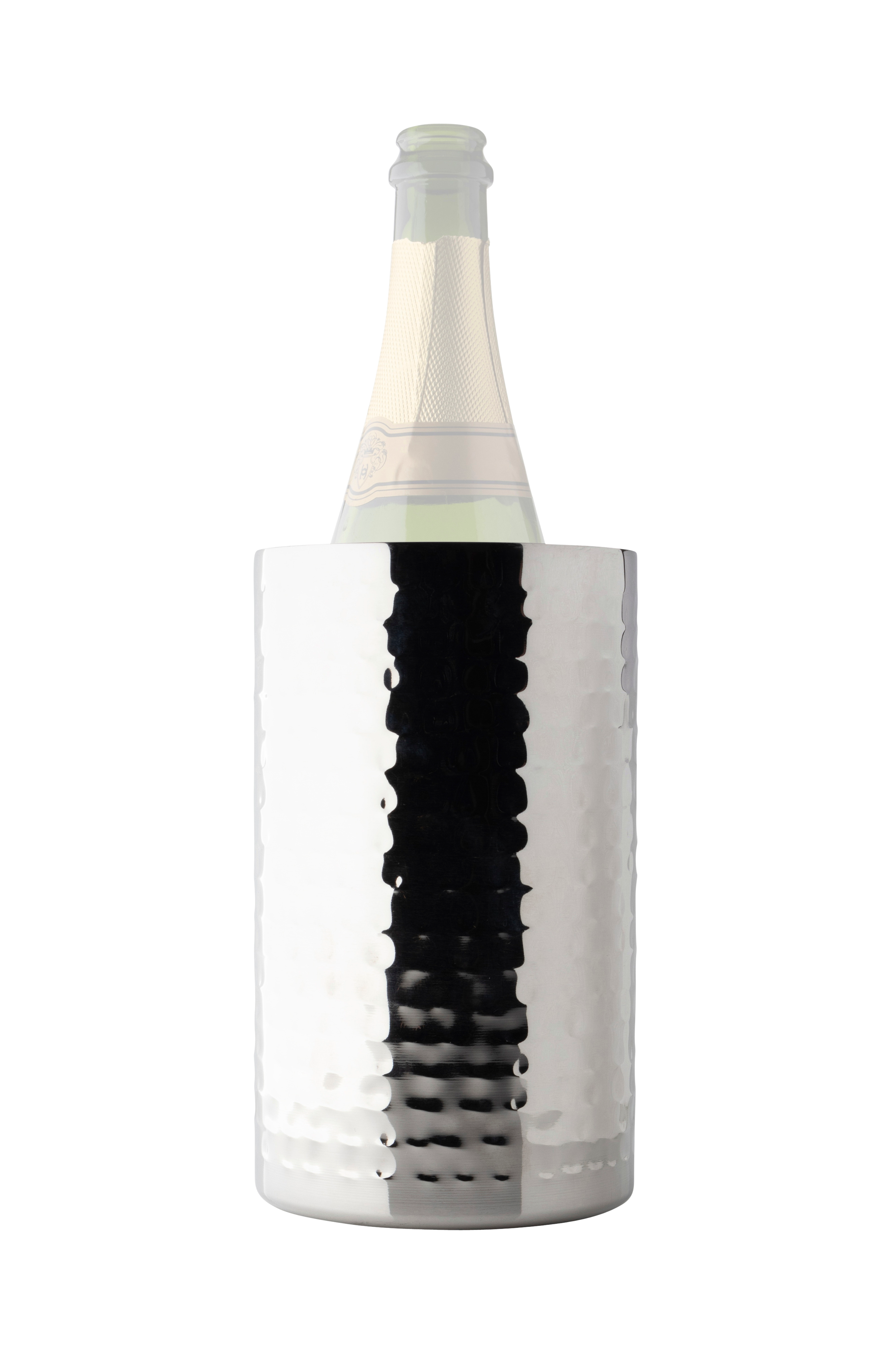 Elegant vinkøler med en diameter på 12 cm og en højde på 20 cm. Fremstillet af hamret rustfrit stål.