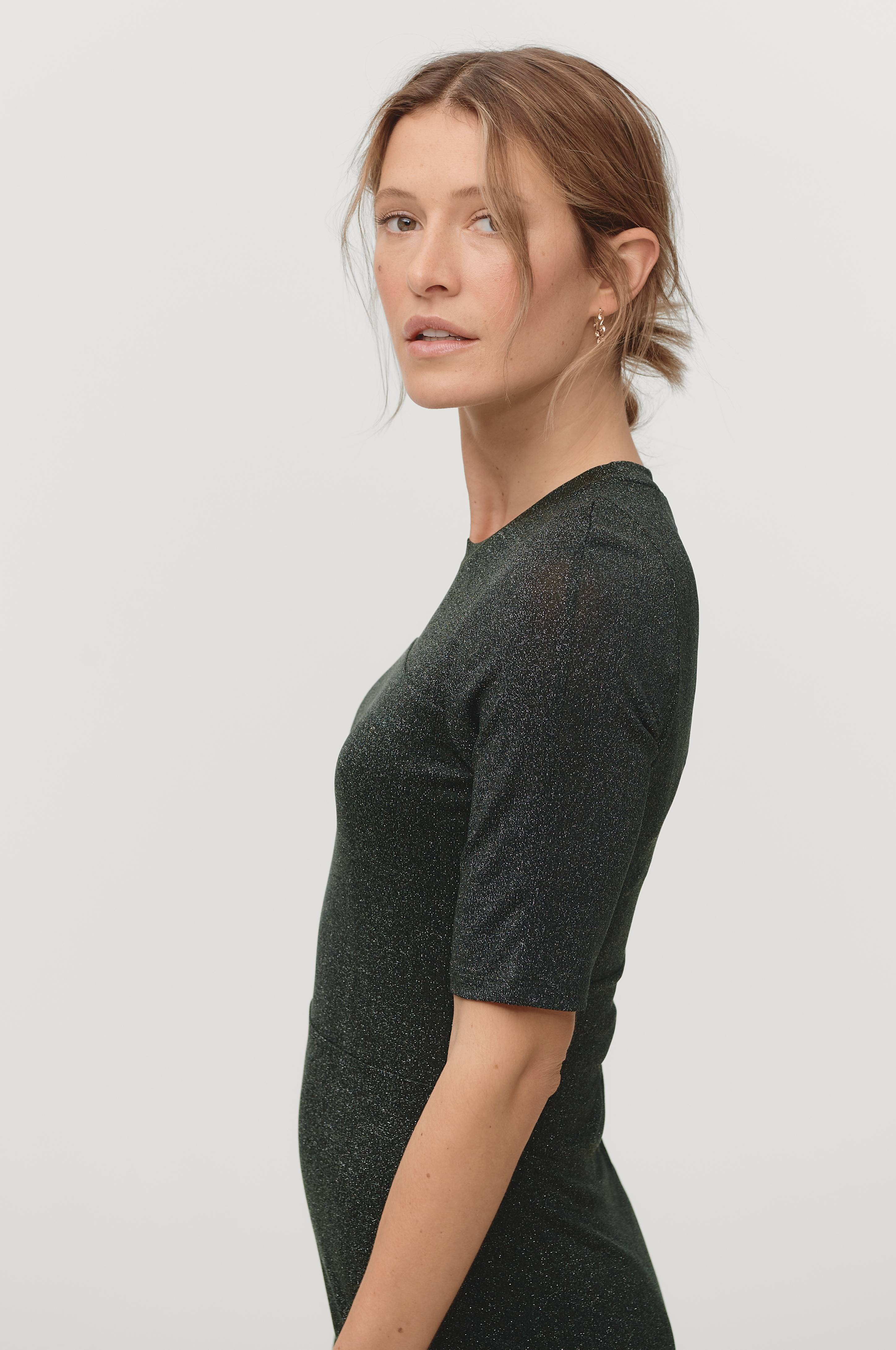 Kjole i glitrende stretchjersey. Kropsnær model med A-formet underdel. Rund halsudskæring med rib og kort ærme. Længde ca. 116 cm i str. S.
