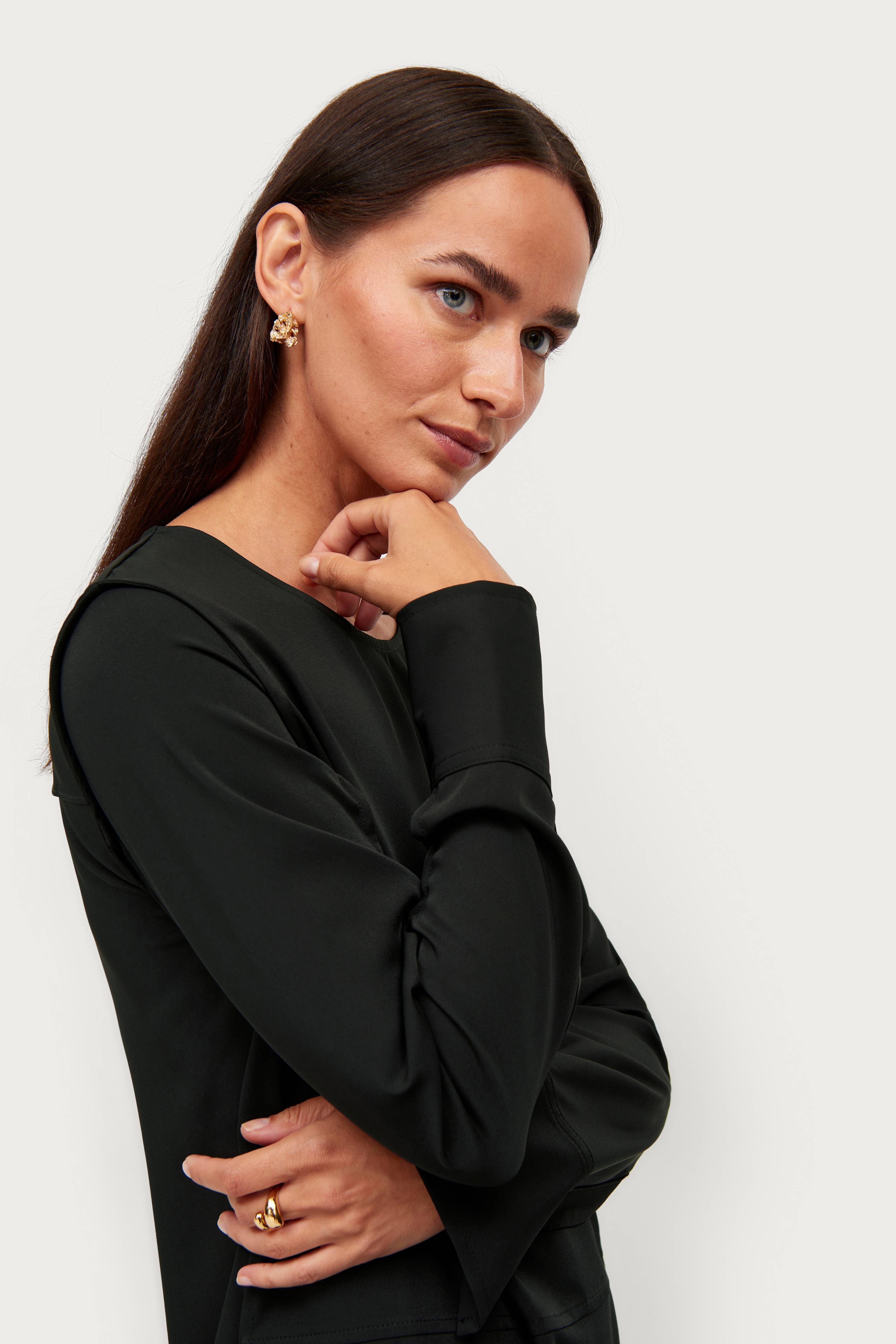 • Stilren kjole• Lige, knælang model• Dekorative sømme på ærmerne og ved taljen• Langt ærme med manchet• Slå-om detalje nede foran• Dekorativ linning• Længde: 95 cm i størrelse 36