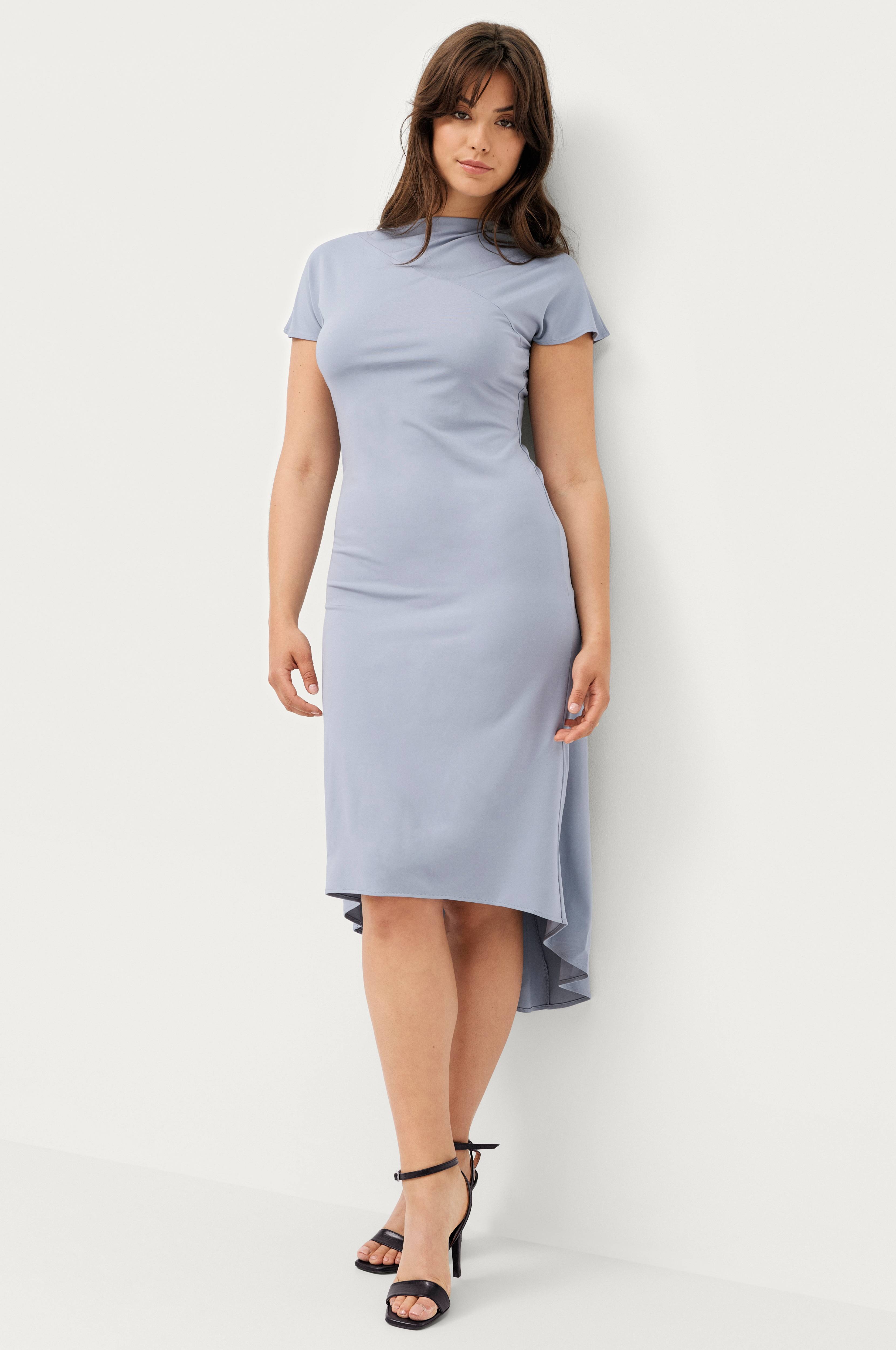 • Stilren kjole i viskose• V-udskæring bagpå• Høj, lige halsudskæring foran• Korte ærmer• Længere bagpå• Længde: 127 cm i størrelse S