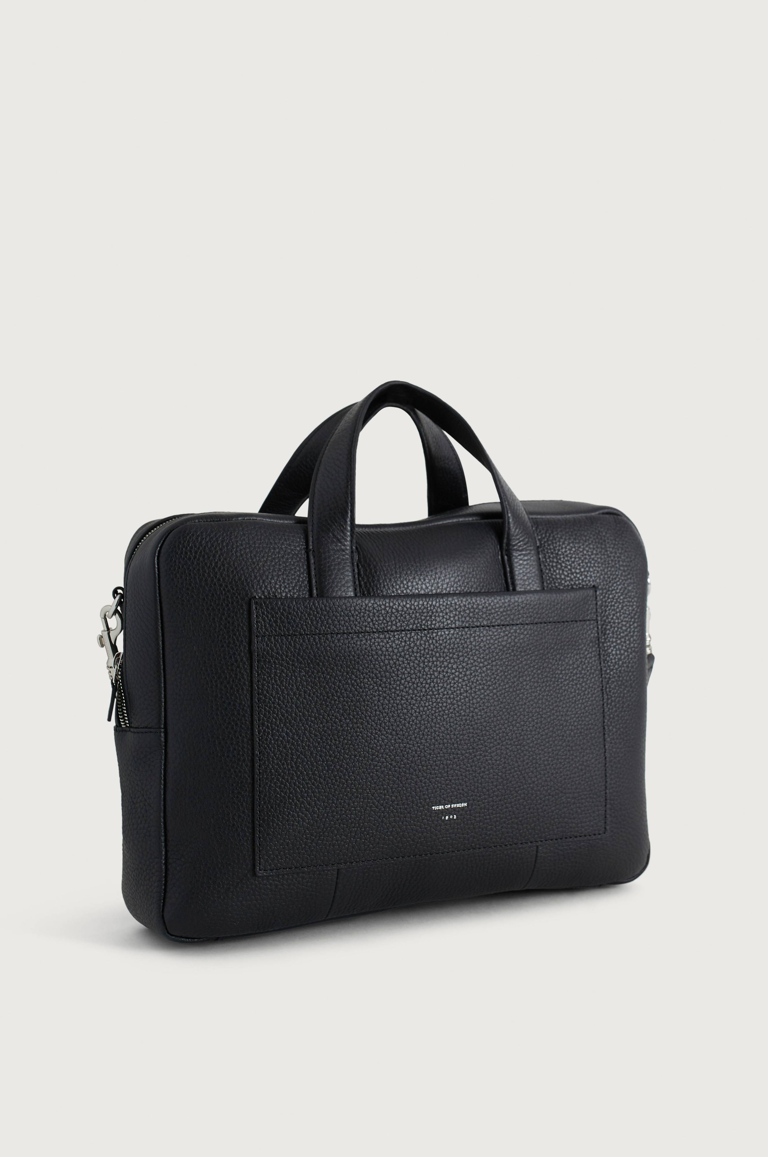 Taske i strukturmønstret skind. En stor, udvendig åben lomme på den ene side og en mindre, udvendig lomme med magnetlukning på den anden. Det største rum lukkes med lynlås. Indersiden er foret i polyestertekstil og har en åben lomme. Passer til en 15 tommers computer. Justerbar og aftagelig vævet skulderrem. Størrelse: 26 x 36 x 7 cm.