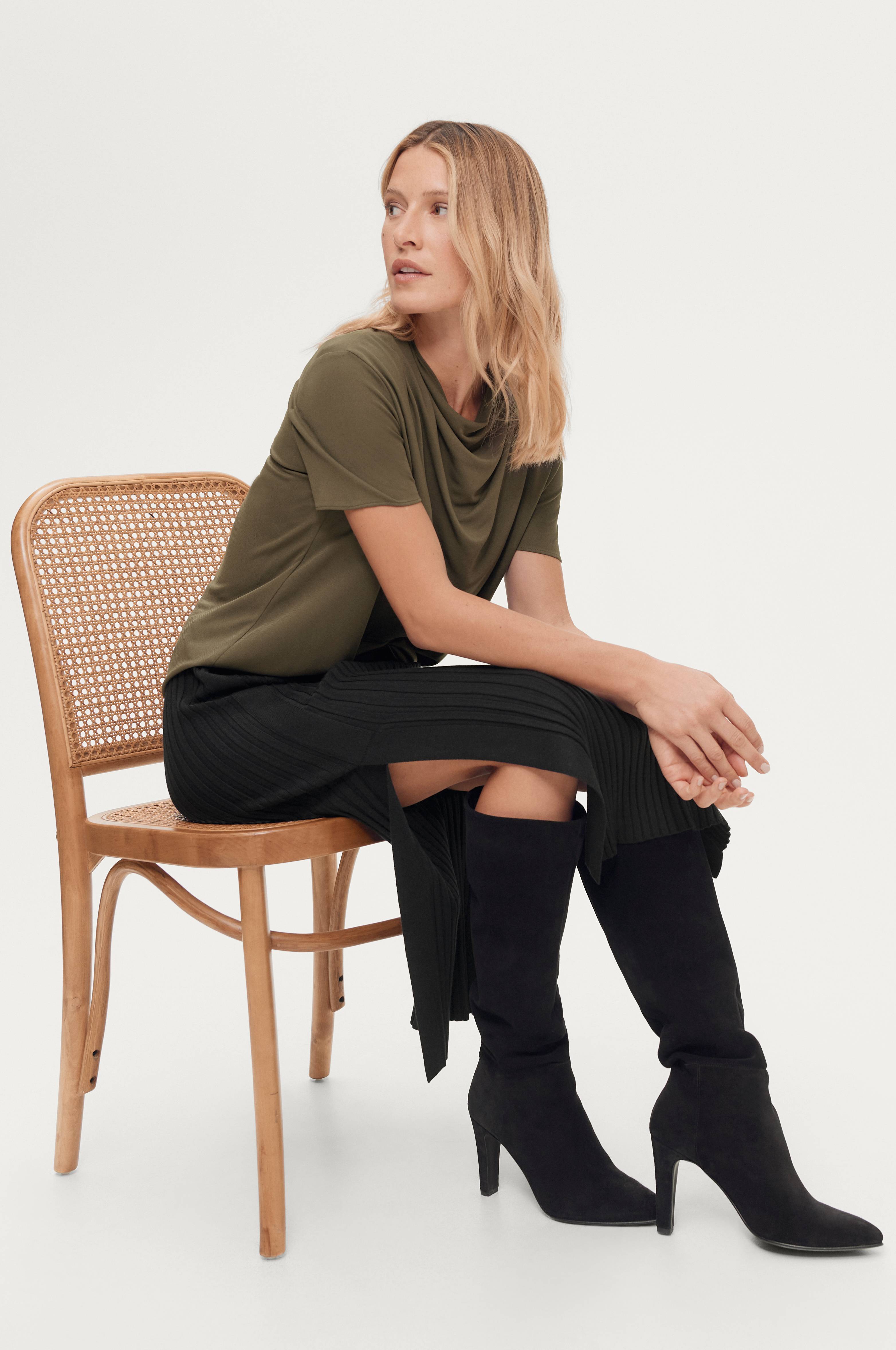 Top Volona J fra Tiger of Sweden i tynd og fin jersey af viskoseblanding med glans. Korte ærmer og draperet vandfaldsudringning. Skjult lynlås bagpå.