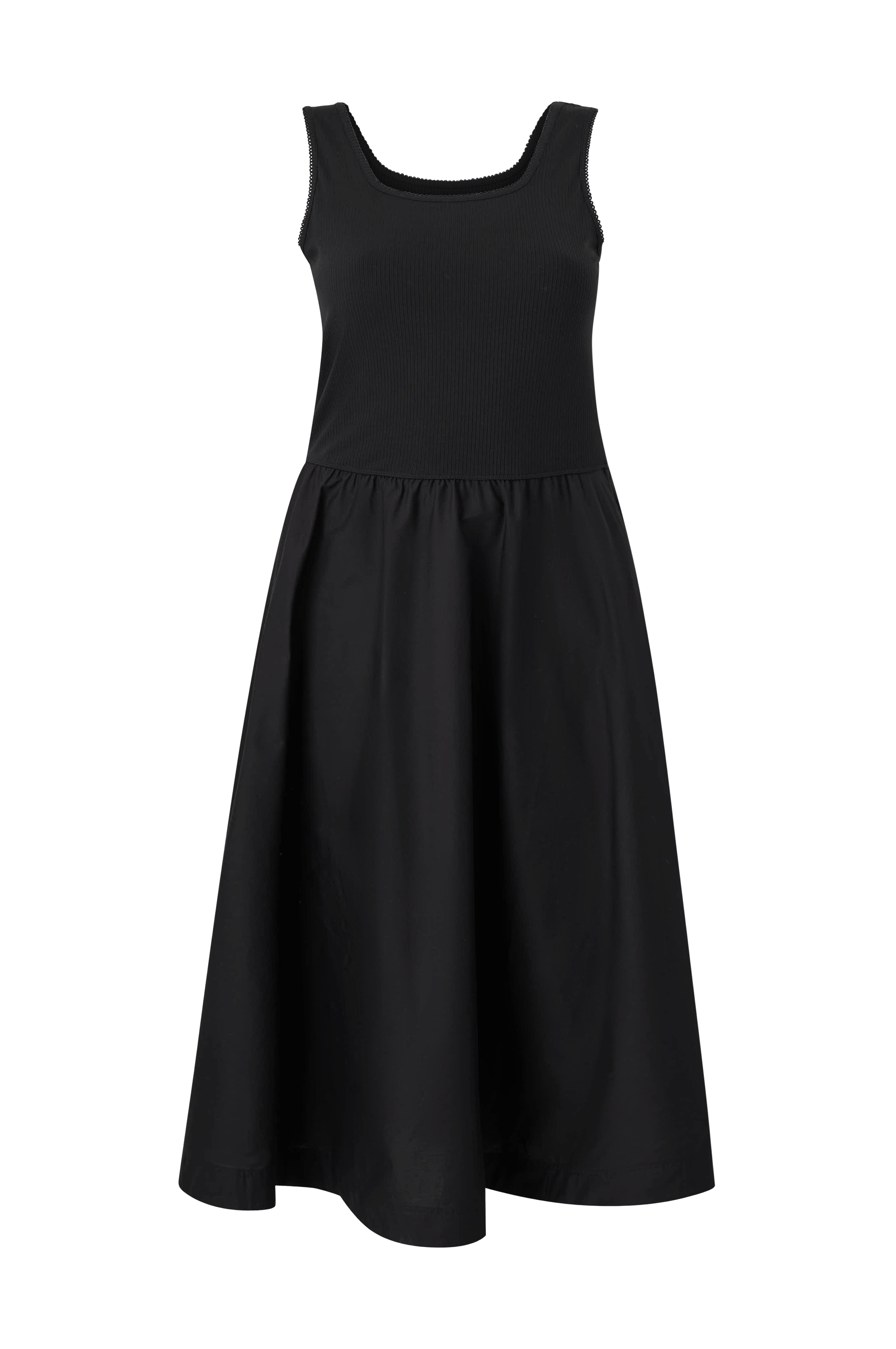 • Lang, ærmeløs kjole med rund halsudskæring• Ribbet top• Bølget blondekant rundt om halsudskæringen og omkring ærmeåbningerne• Vævet nederdel med svaj med samling ved taljen• Sidelommer• Længde: 129 cm i størrelse 46