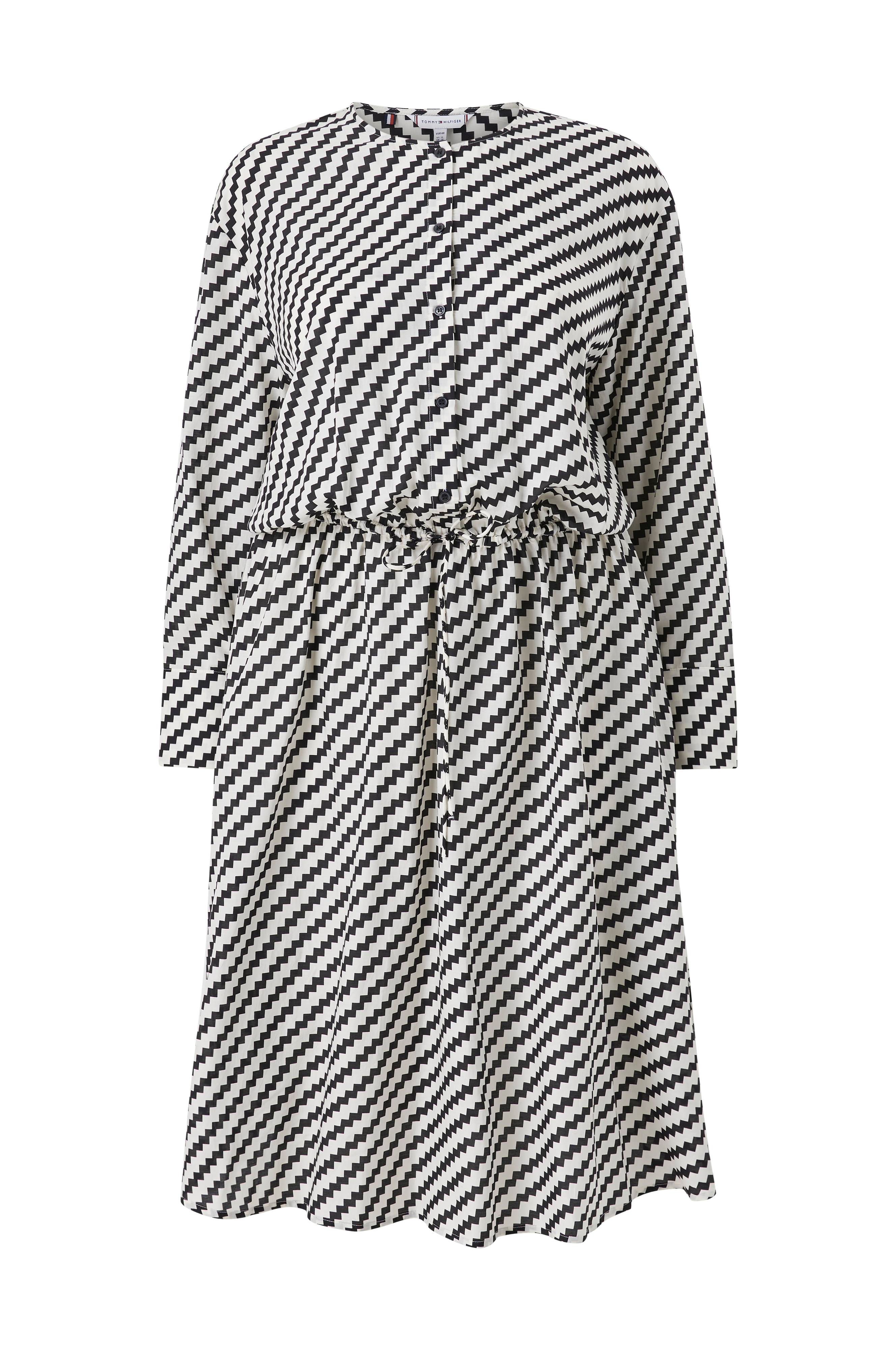 • Kjole i bomuld med printet mønster• Rund hals• Knapper ned til taljen• Elastisk bånd ved taljen med bindebånd• Lange ærmer• Manchet med en knap• Store størrelser• Længde: 129 cm i størrelse 48