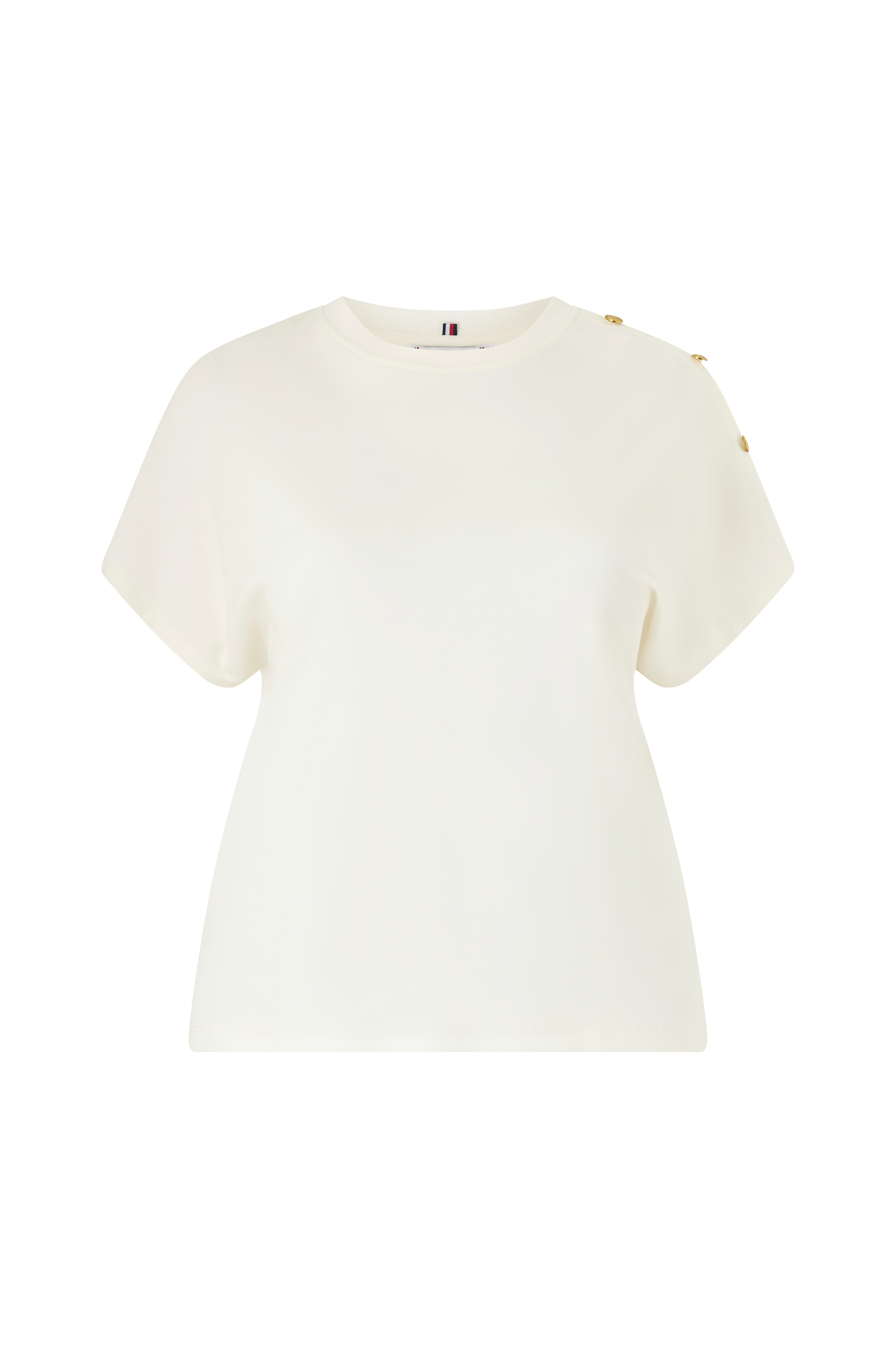 • Top i bomuld med rund, ribbet halsudskæring• Korte korte ærmer• Guldfarvede, dekorative knapper på en skulder