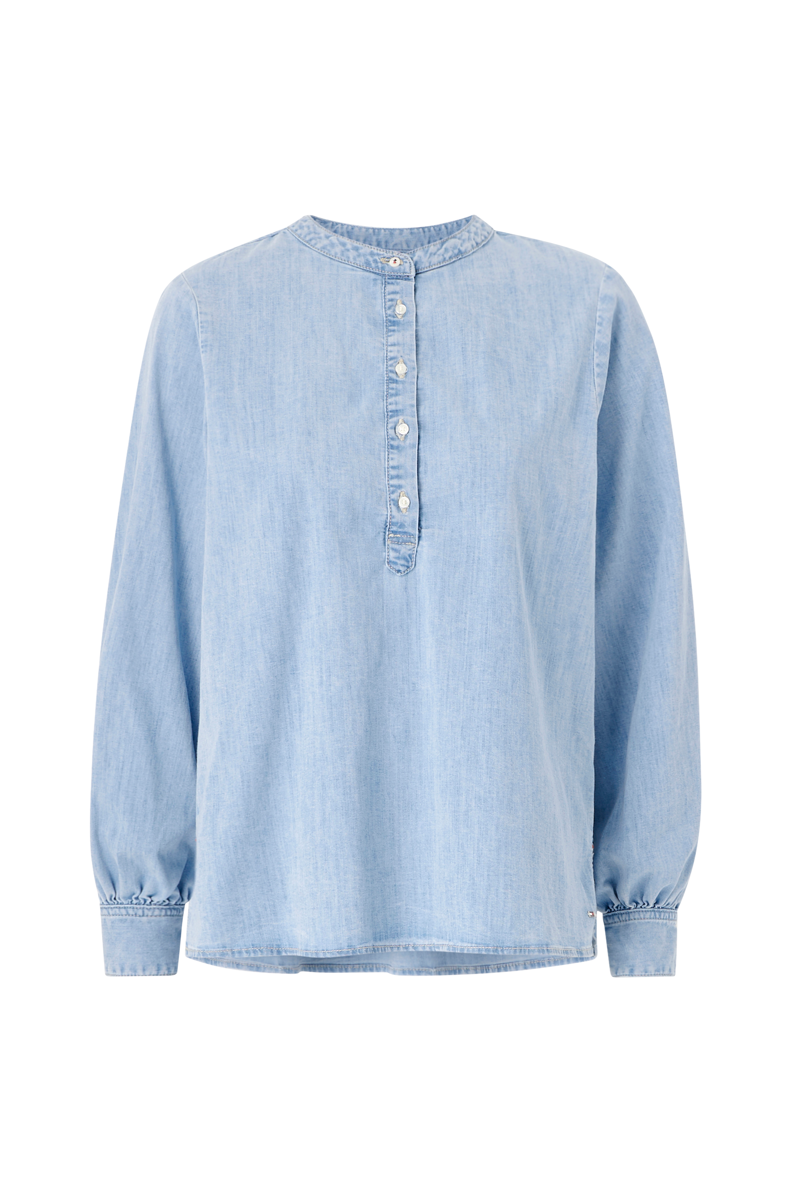 • Lige model i denim• Rund hals• Kort knaplukning foran• Linning med plissering bagpå• Langt ærme med manchetter ved manchetterne• Ventilation nede i siderne