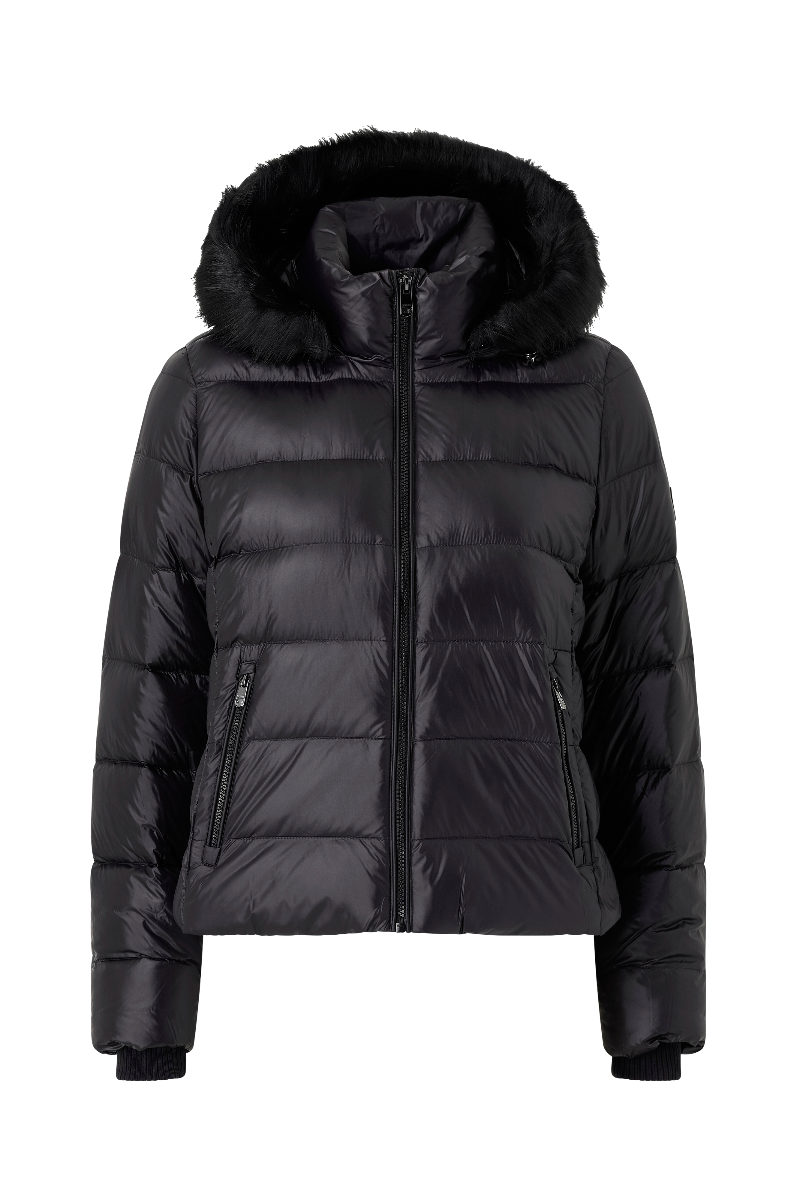 • Dunjakke med vandafvisende, skinnende overflade og varmende isolering• Fast, justérbar hætte med aftagelig kunstig pels• Opretstående krave• Lynlåslommer• Indvendige ribmanchetter ved manchetterne• Længde: 56 cm i størrelse S