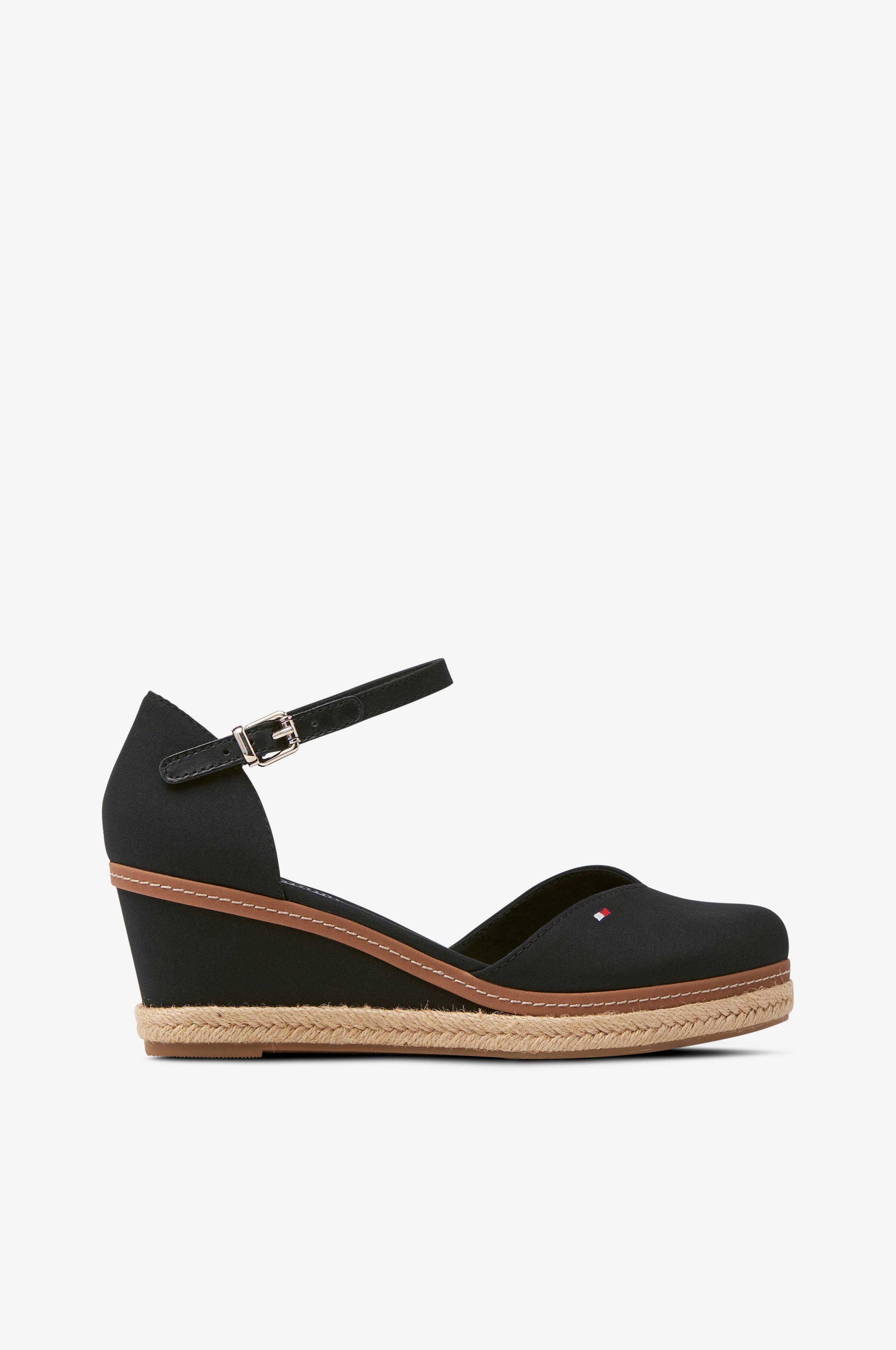 Espadrillos i mocka och textil med klädd kilklack och repklädd sulkant. Hel häl och hel tå. Klackhöjd ca 6,5 cm.