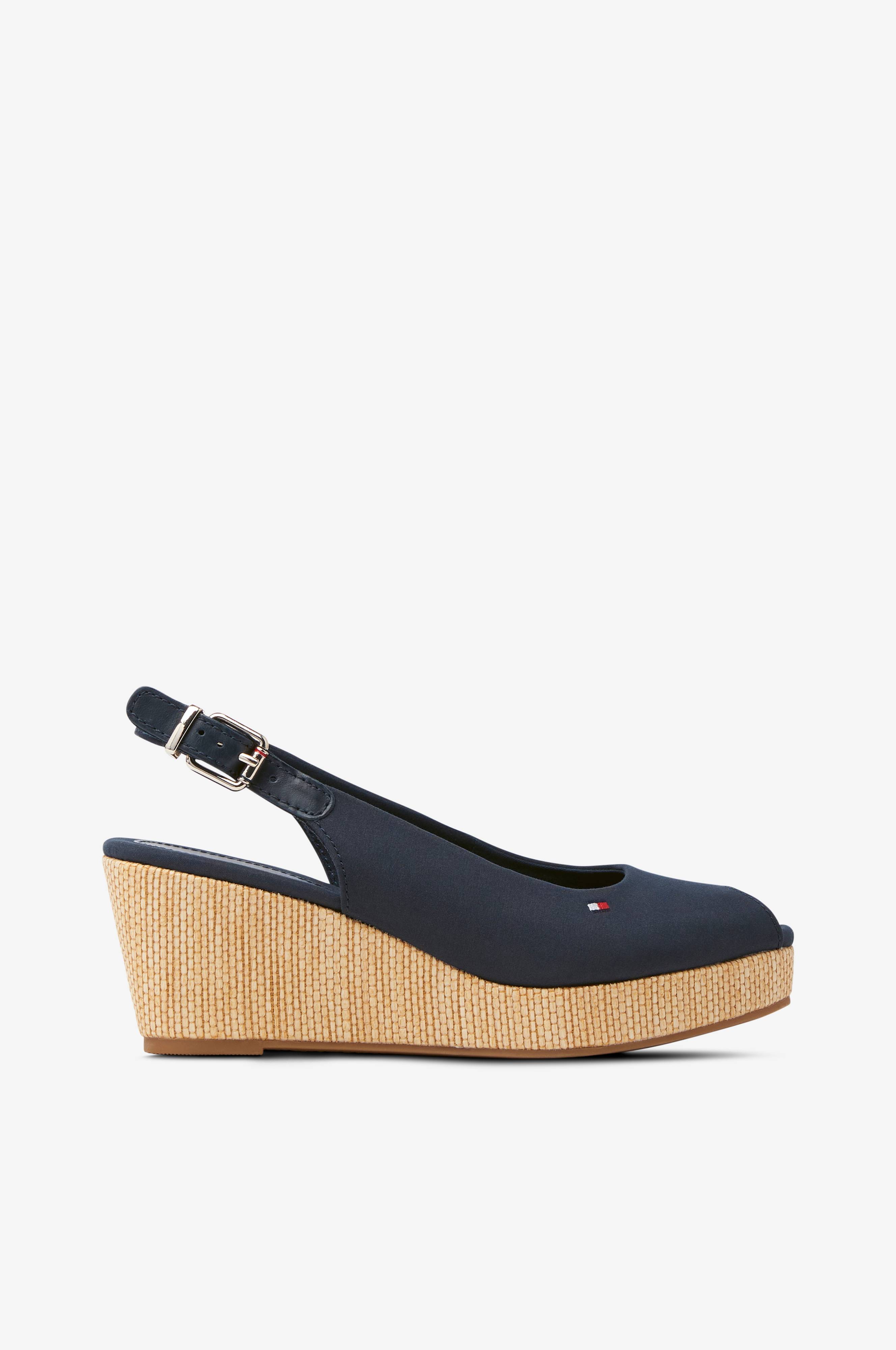 Espadrillos i ruskind eller tekstil med beklædt plateausål og kilehæl. Slingbackmodel med åben tå og hælrem som har et justerbart spænde på siden. Hælhøjde ca. 6,5 cm. Sålhøjde ca. 2,5 cm.