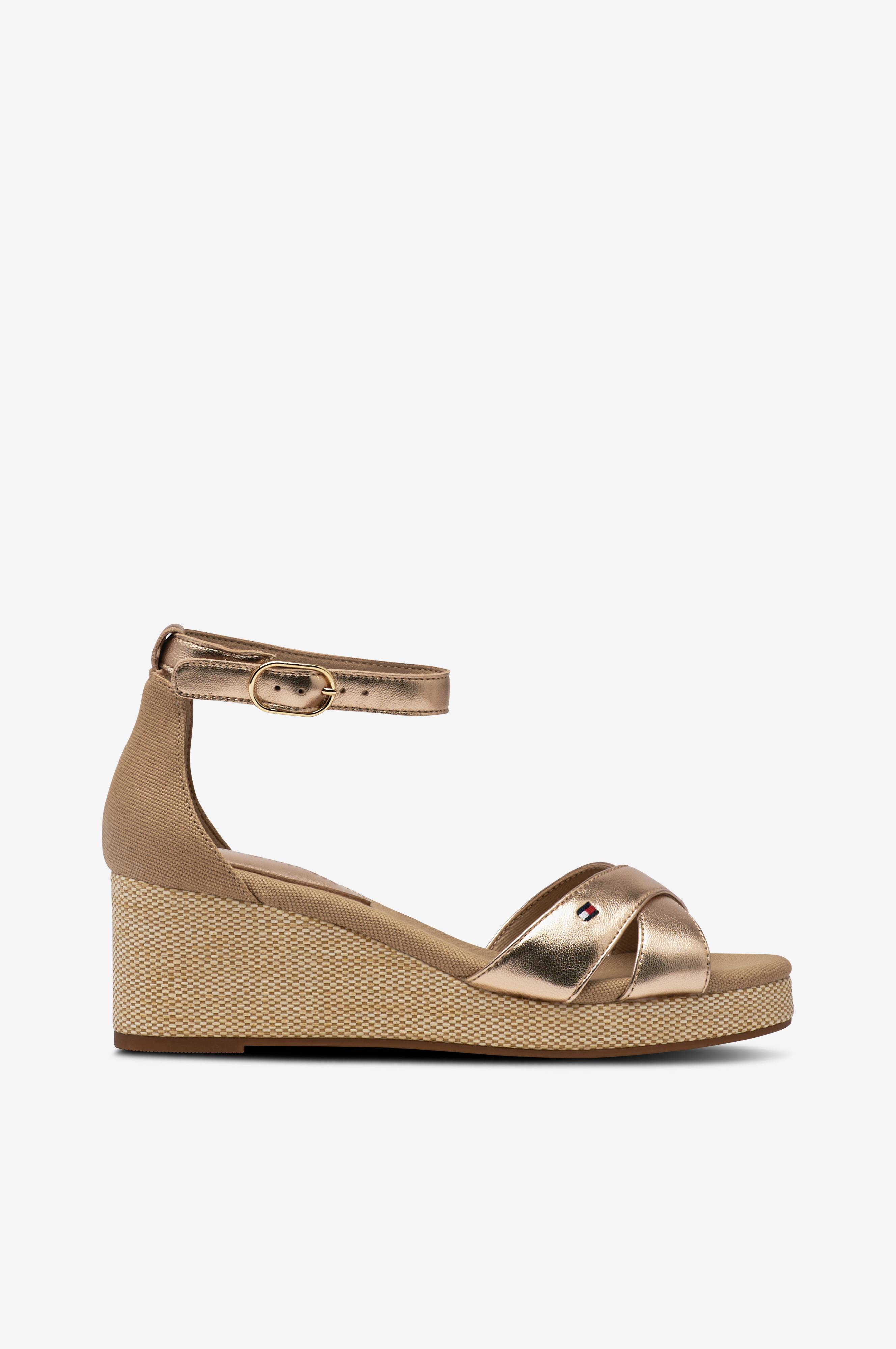 • Sandal med hæl med remme i guldfarvet læder• Hælkappe i tekstil• Justérbar ankelstrop med metallukning• Blød polstret, stofbetrukket fodseng• Wedgehæl med kant i tekstil• Ydersål i gummi• Hælhøjde: 5 cm