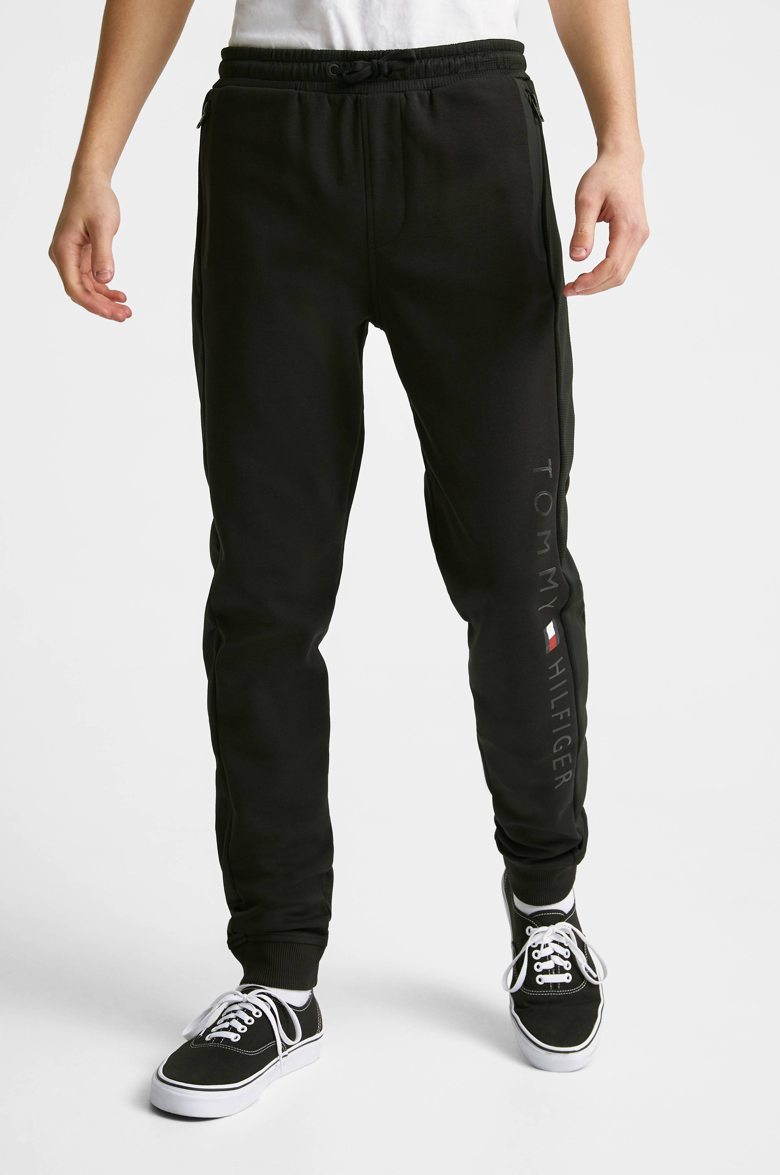 Sweatbukser med to lommer med lynlås. Elastisk linning med løbegang. Striber i meshlignende stof langs benenes yderside. Print på det ene ben. Rib i benkant.