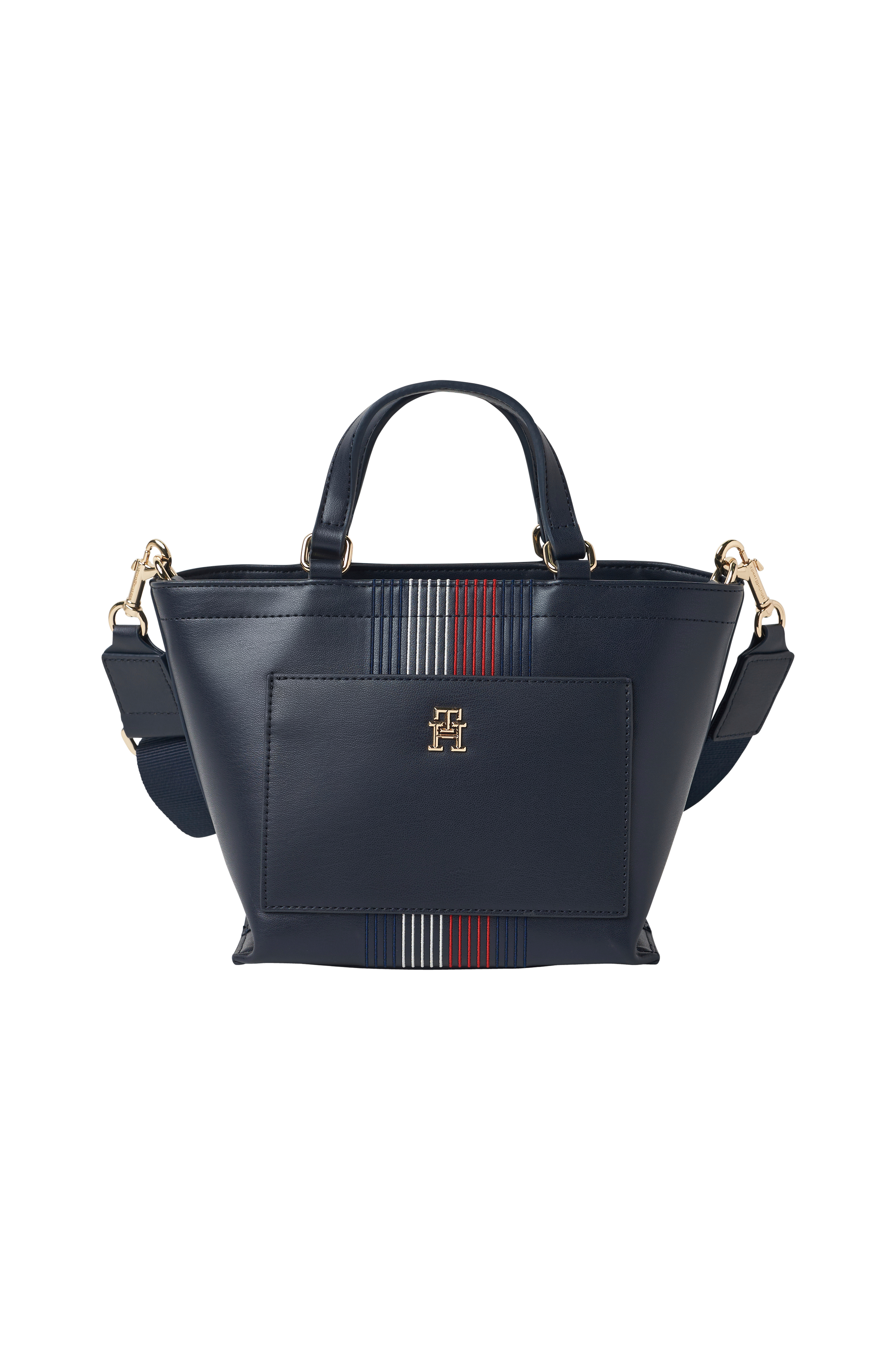 • Taske i imiteret læder • På den ene side er der en udvendig lomme prydet med et logo i guldfarvet metal • Broderede striber på den ene side • Lukning med lynlås • Indvendig lomme med lynlås • To bærehåndtag • Justérbar, aftagelig skulderstrop • Mål: B 28 x H 18 x D 12 cm