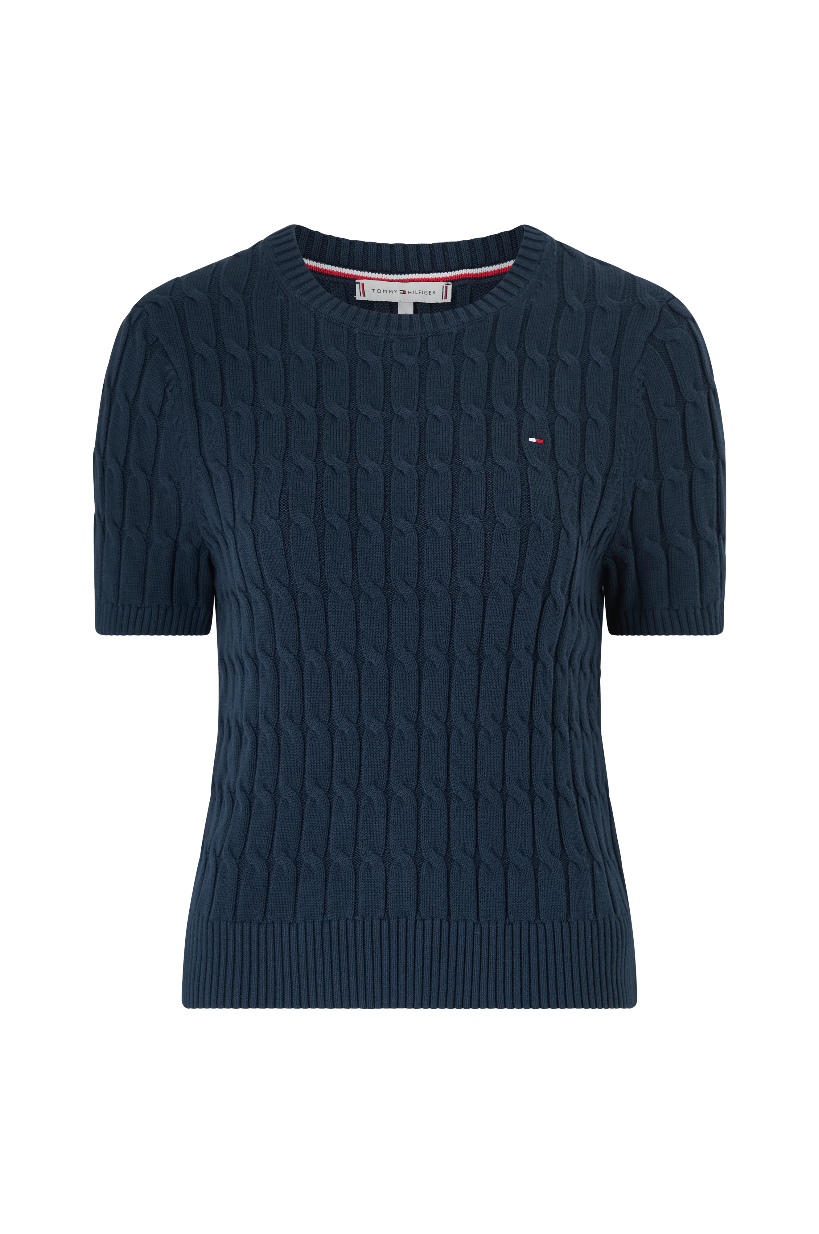 • Kabelstrikket trøje med korte ærmer• Rund, ribbet halsudskæring• Ribstrik ved manchetterne og ved nederste kant