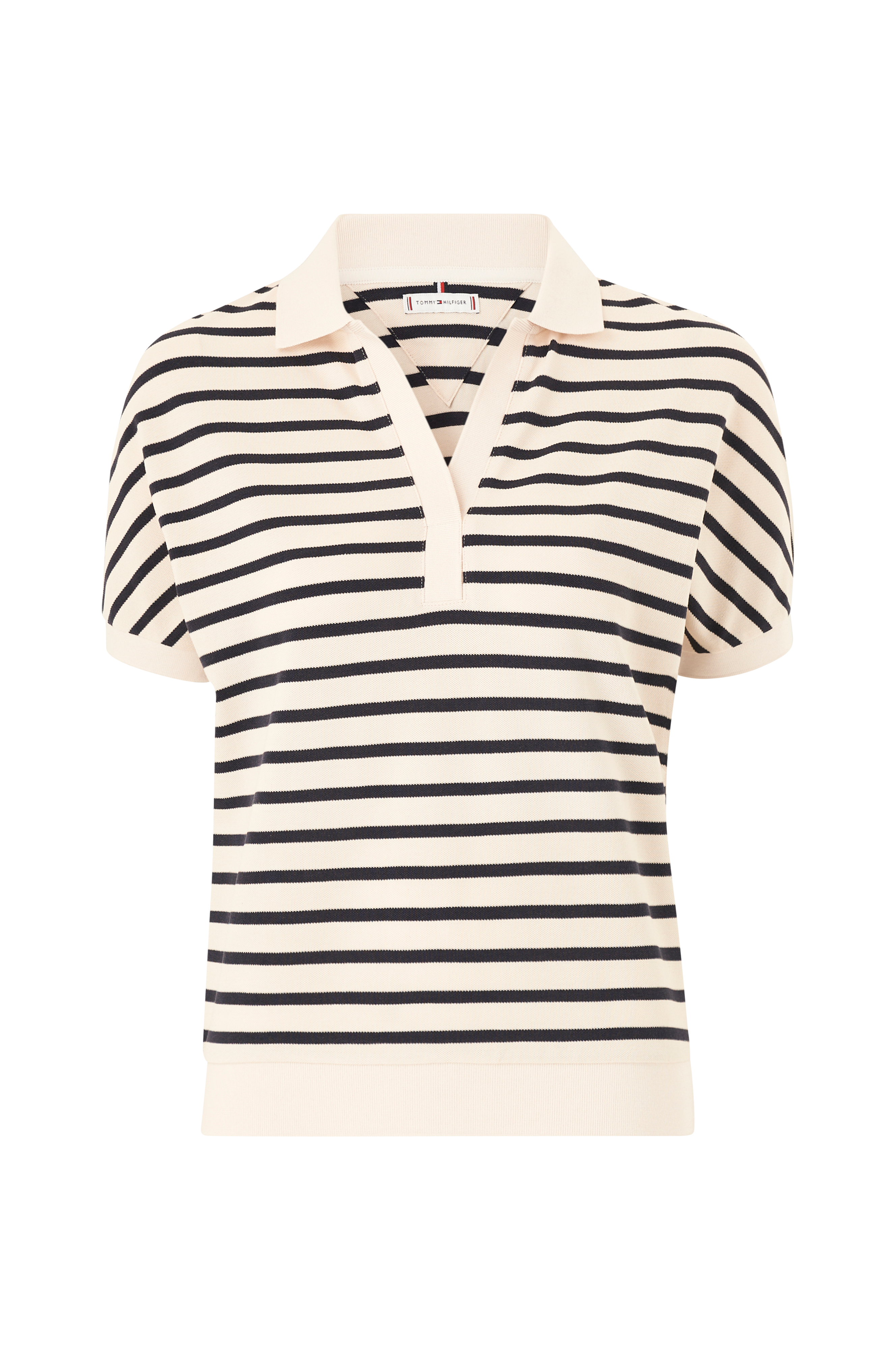 • Trøje med kort ærme• Ribbet krave• V-formet halsudskæring• Ribmanchet ved nederste kant