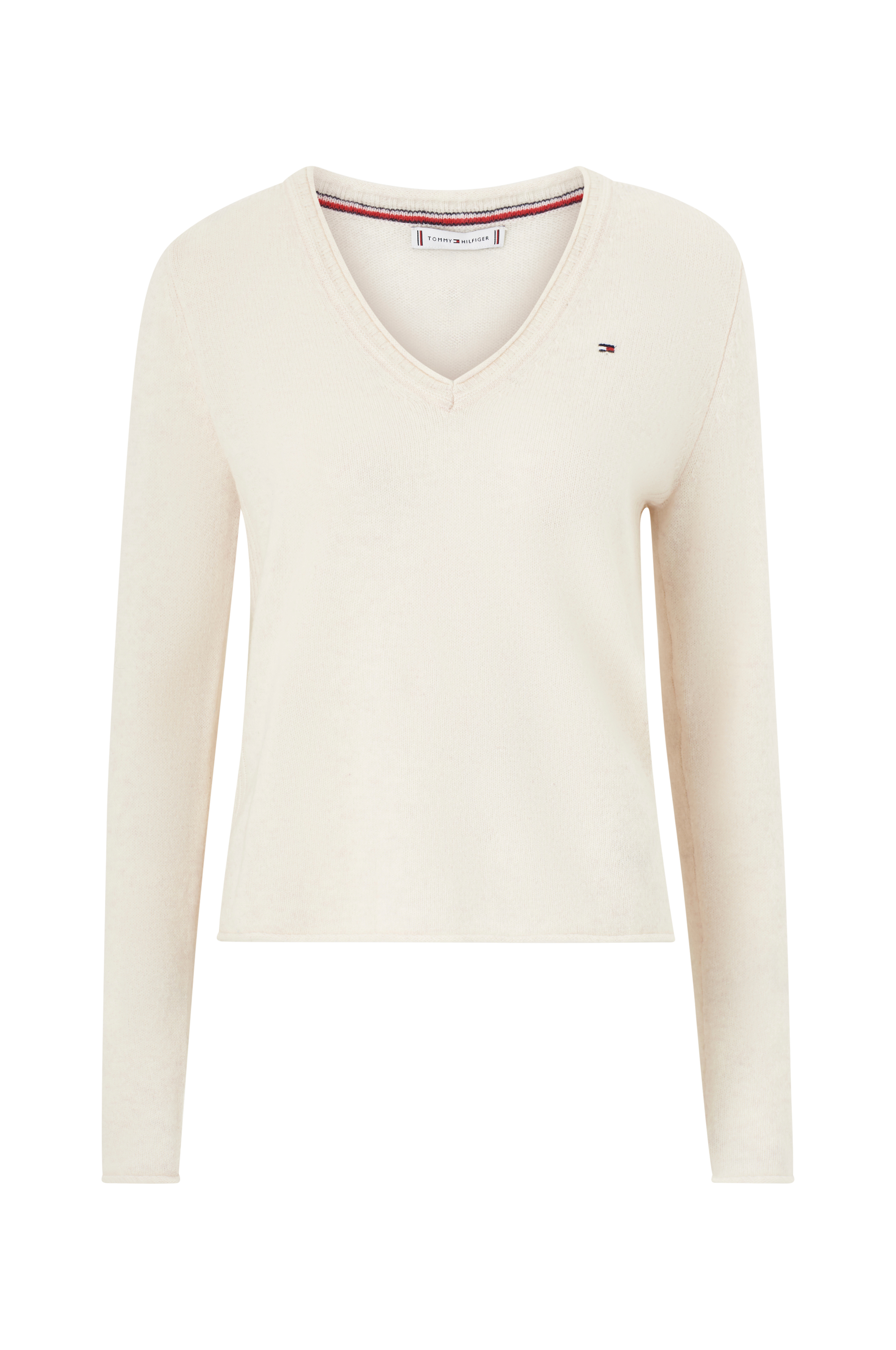 • Model med strukturstriber i siderne• V-formet halsudskæring• Langt ærme• Rullekanter
