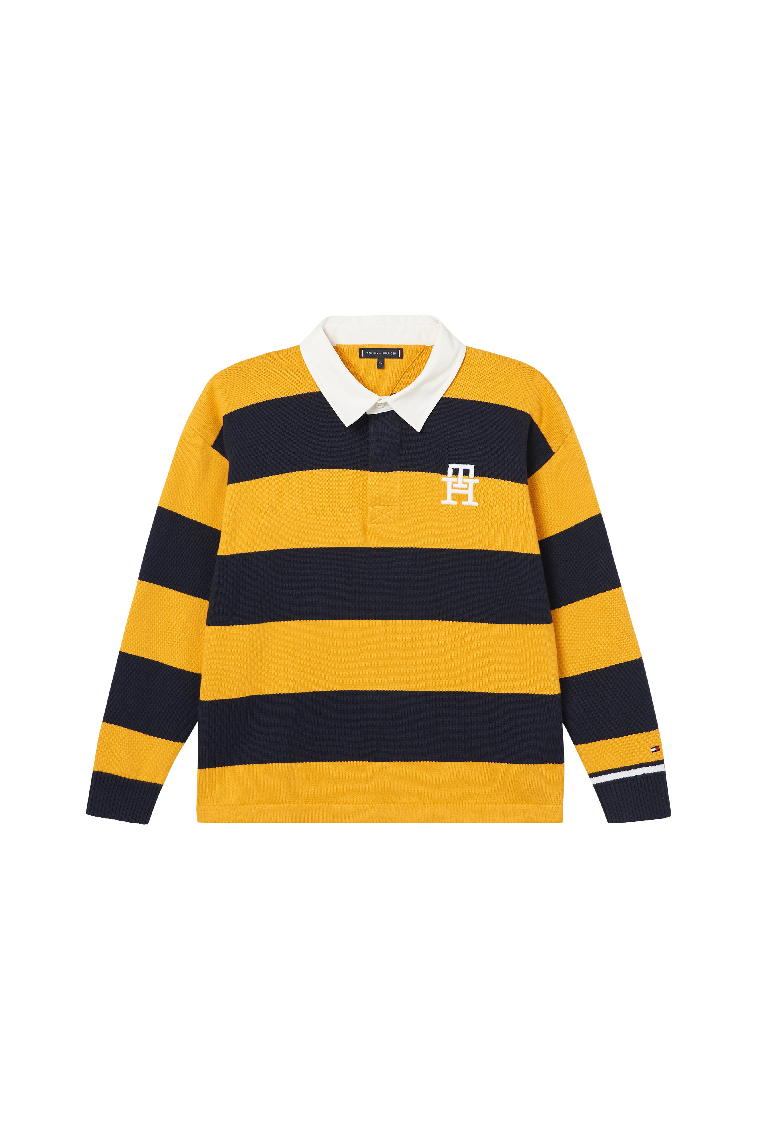 • Strikket trøje med vævet krave• To knapper i halsen• Broderi på brystet• Ribmanchetter ved manchetterne