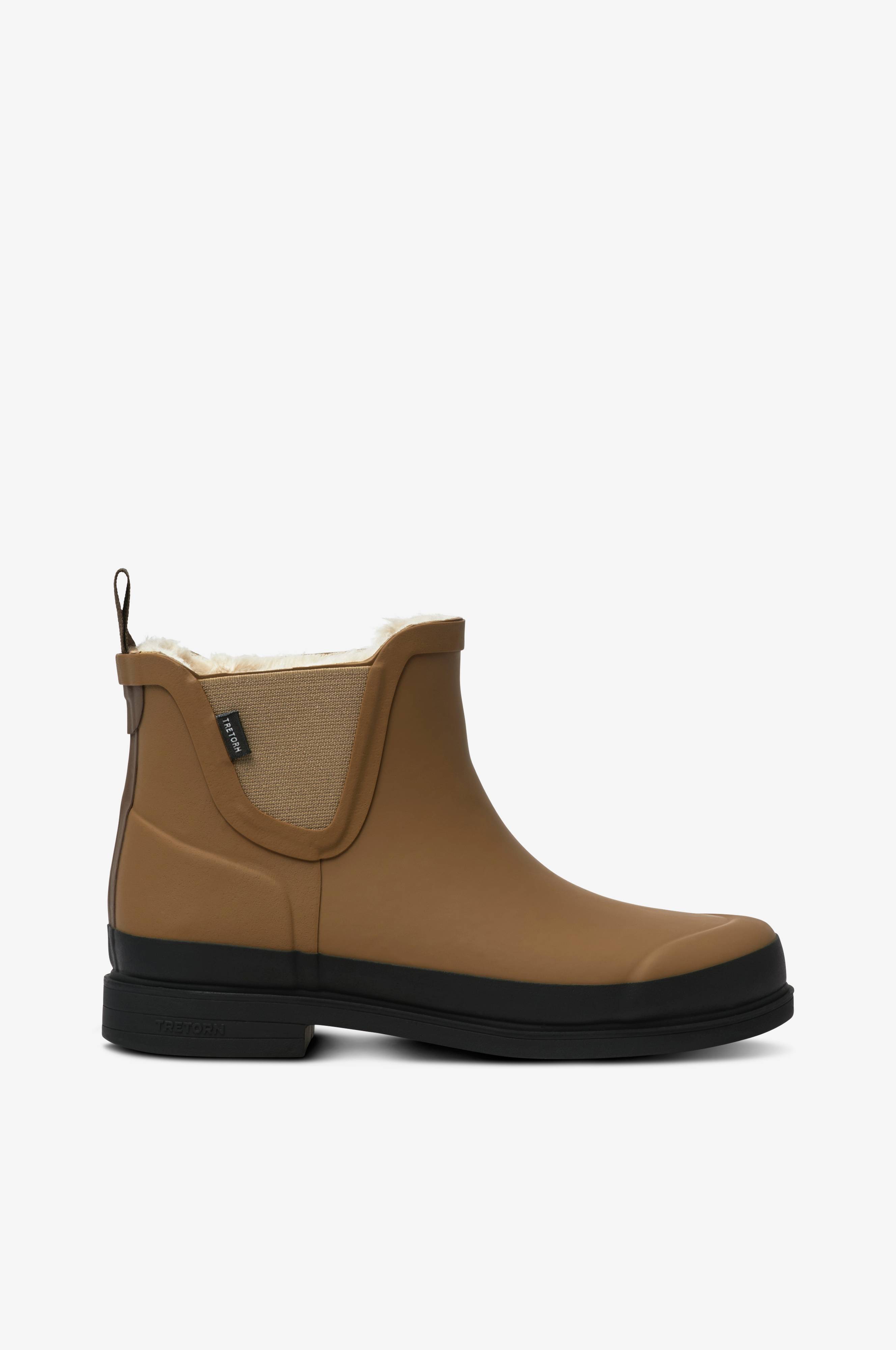 Gummiboots Eva W fra Tretorn i praktisk, stilren model med klassisk silhuet. Kraftig ydersål og forstærket tå og hæl. Håndlavet i PVC-frit naturgummi. Med elastikker på siderne og trækstrop ved hælen er skoen let at komma i og tage af. Ergonomisk formet læst for god pasform. Indersiden har et varmt, blødt for i kunstpels som holder fødderne varme og tørre.