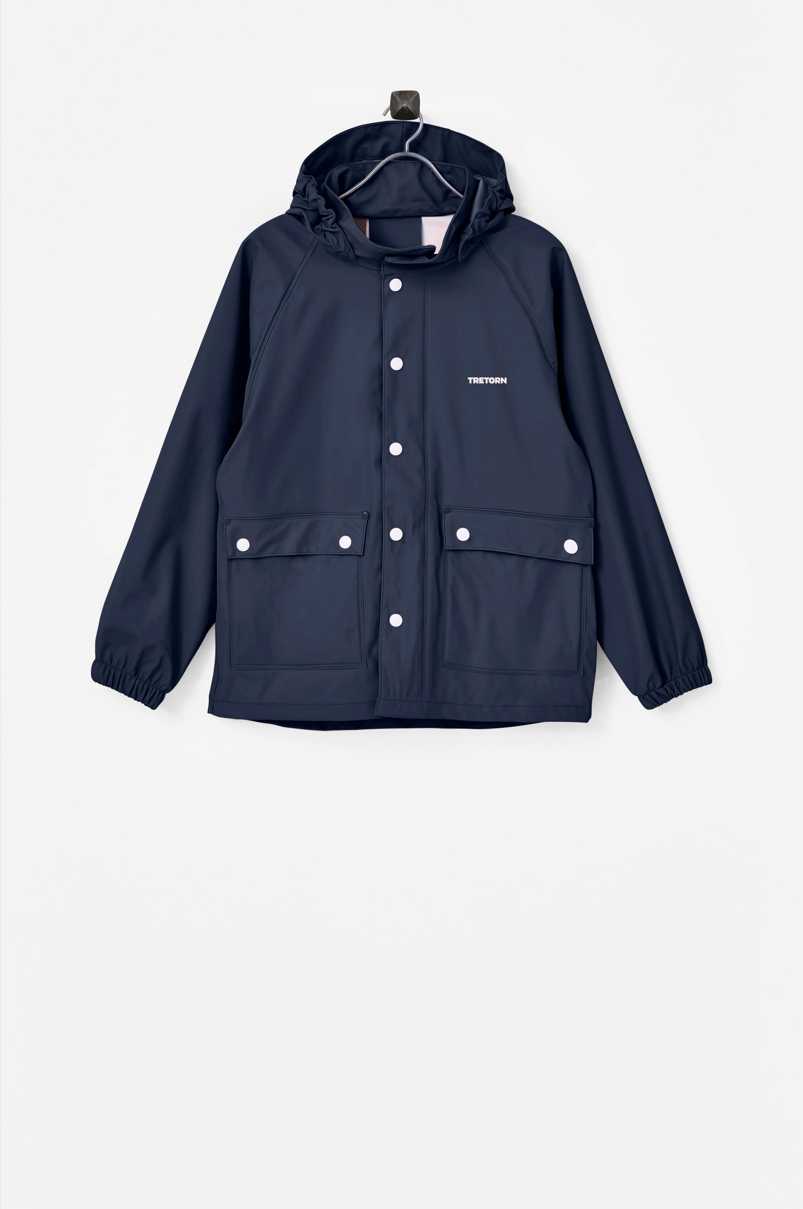 Regnfrakke fra Tretorn i vandtæt gummikvalitet med aftagelig hætte, som har indsat elastik i siderne for bedste pasform. Lukkes med trykknapper. To lommer foran med lommeklap og trykknapper. Indsat elastik i ærmekant. Refleksdetalje bagpå.