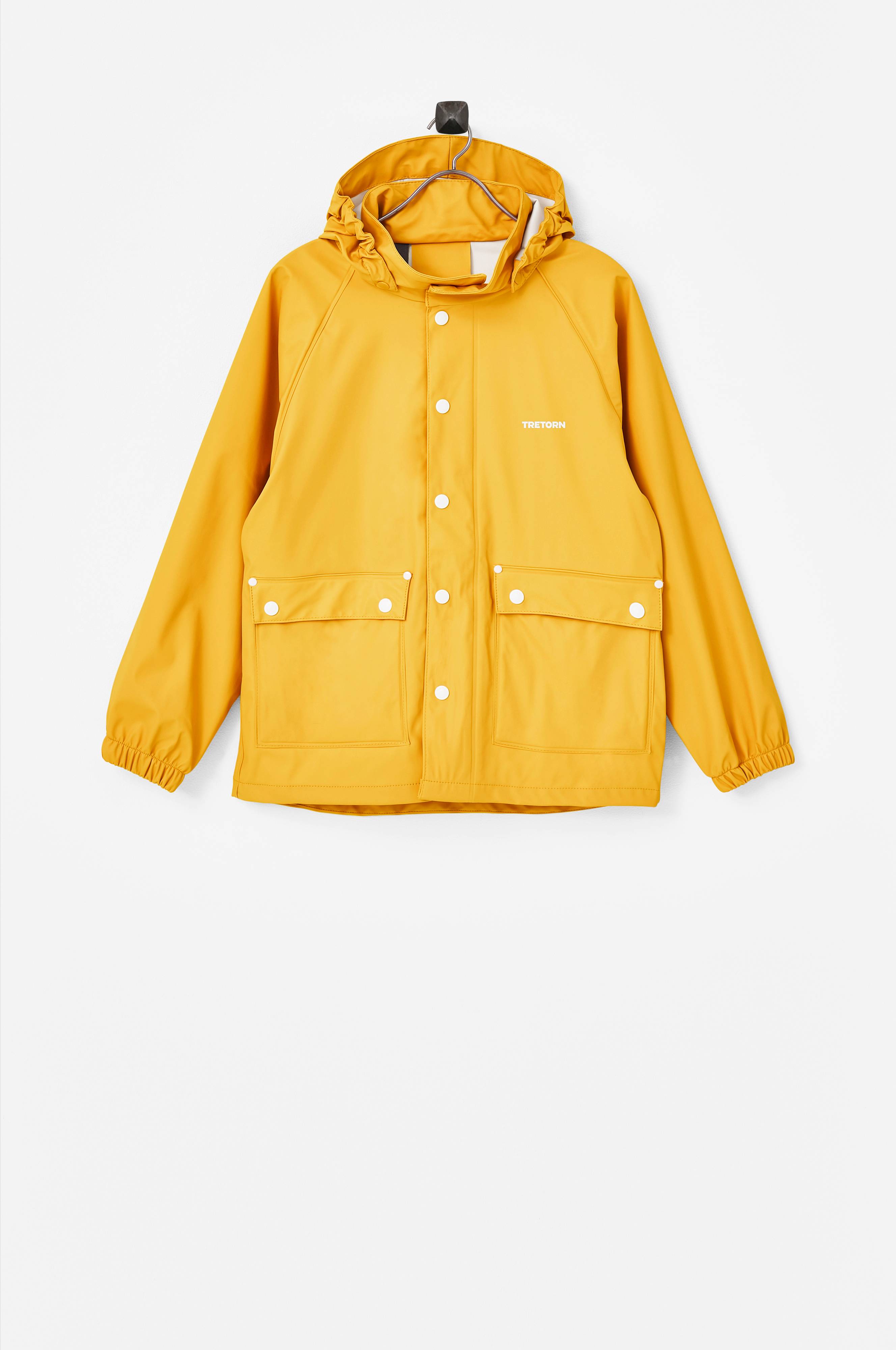Regnfrakke fra Tretorn i vandtæt gummikvalitet med aftagelig hætte, som har indsat elastik i siderne for bedste pasform. Lukkes med trykknapper. To lommer foran med lommeklap og trykknapper. Indsat elastik i ærmekant. Refleksdetalje bagpå.