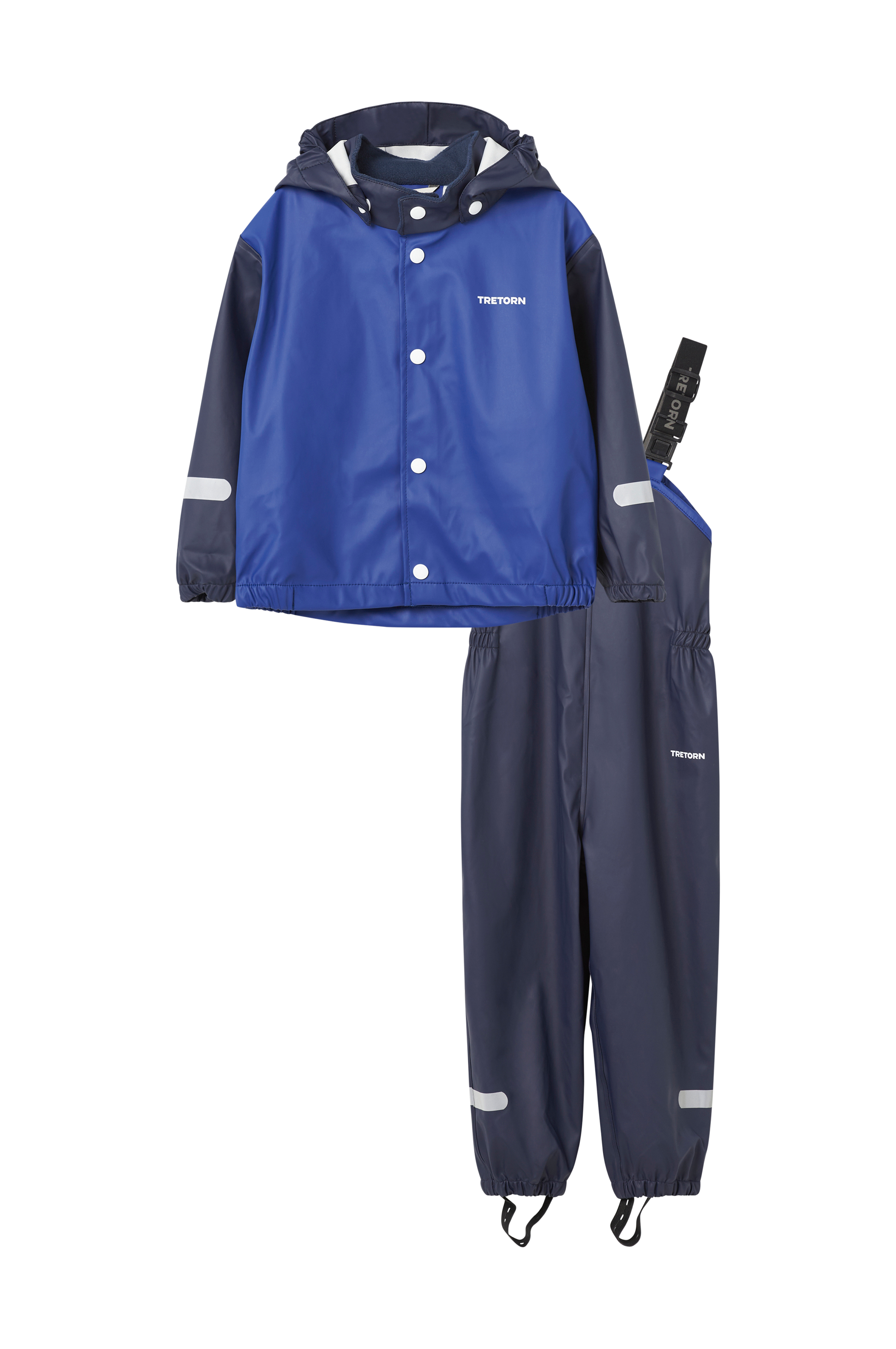 • Vandtæt regnsæt i PU-materiale • Lamineret bagside • Svejsede sømme • Aftagelig hætte med elastik langs forkanten • Trykknapper • Elastik ved manchetterne, nederst og ved enden af benene • Bukser med justérbare seler • Trykknapper i siderne • Aftagelige, justérbare fodstropper i silikone • Reflekterende detaljer • Vandsøjle: 8000 mm