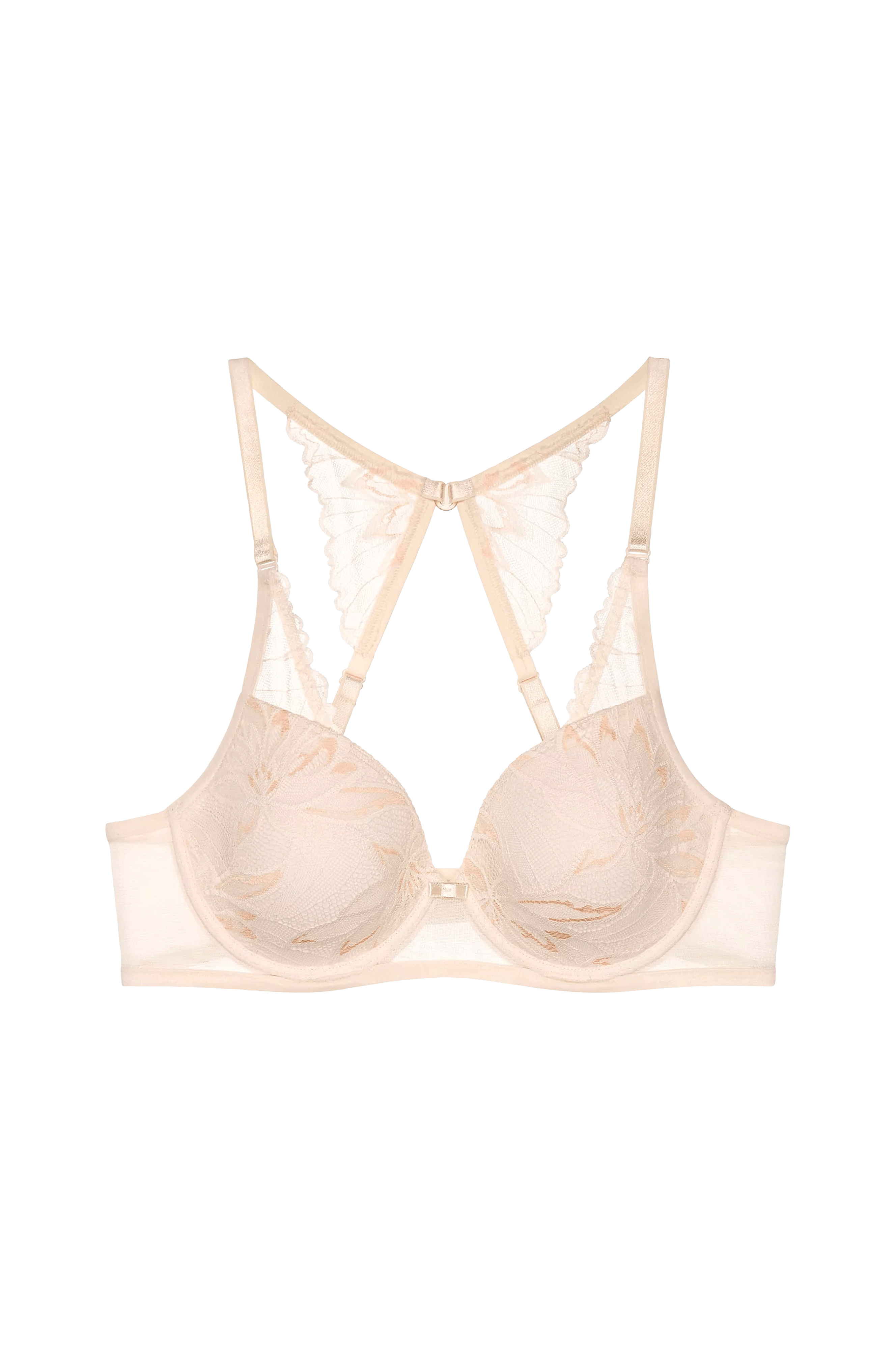 • Blondeklædte skåle med bøjle og tynd polstring• Fleksible, justérbare skulderstropper med blondedetaljer• Hægtelukning i ryggen