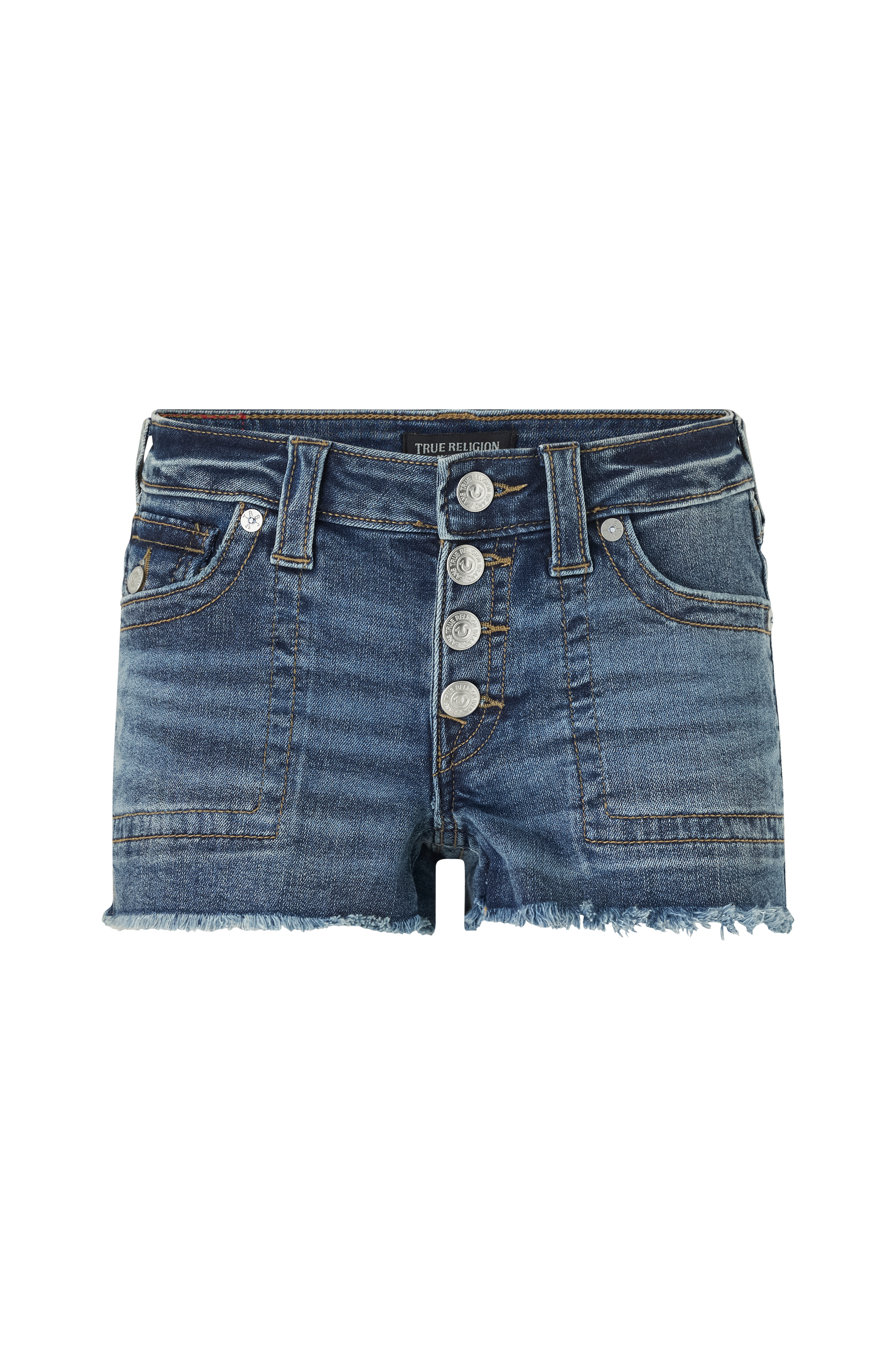• Denimshorts i strækdenim• Knaplukning• Femlommemodel• Knapbare lommelåg på baglommerne• Rå kanter ved enden af benene• Indre benlængde: 7 cm i størrelse 27