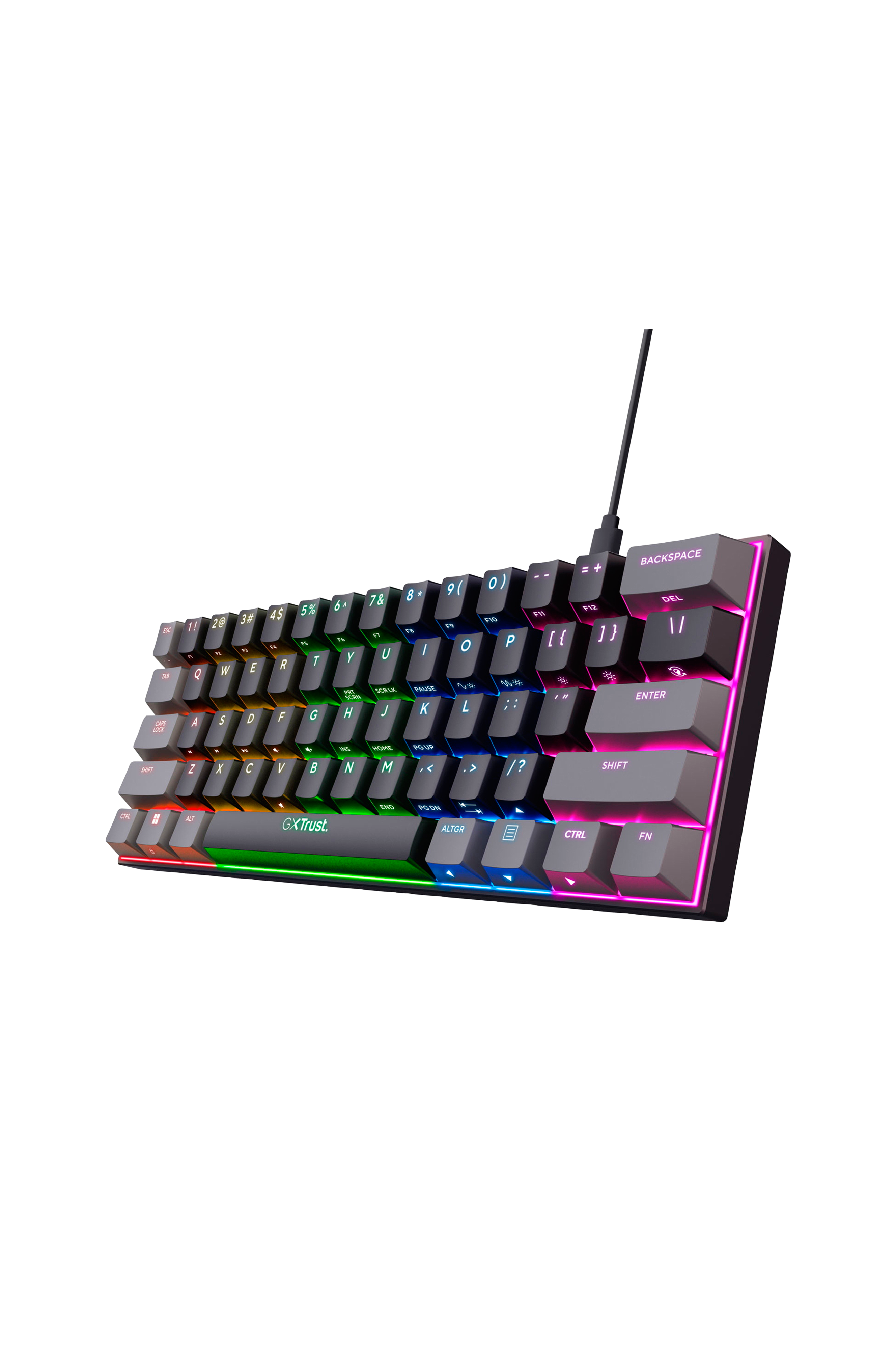 Dette 60% mekaniske tastatur med levende RGB-belysning er designet til optimeret musebevægelse og skrivebordsplads. Røde mekaniske kontakter giver pålidelighed til endeløs gaming, mens tilpasselig belysning og knapprogrammering skræddersyr din spiloplevelse. Det har multimediegenveje, dobbelte funktionstaster til brug i fuld størrelse, aftageligt USB-kabel til bærbarhed og justerbare skridsikre fødder til komfort. Og så er den kompakt, men mægtig, hvilket sikrer sejr i hvert spil med stil og personlig teknologi. Leveres med en brugervejledning og et 1,8 meter langt USB-A til C-kabel.