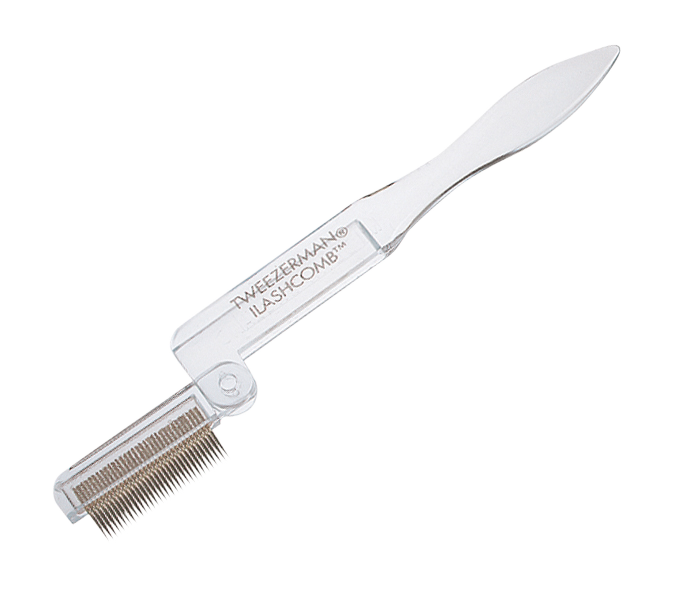 Definerer og skiller vipperne. De helt adskilte, forgyldte metaltænder glider gennem vipperne for at fjerne overskud af mascara.