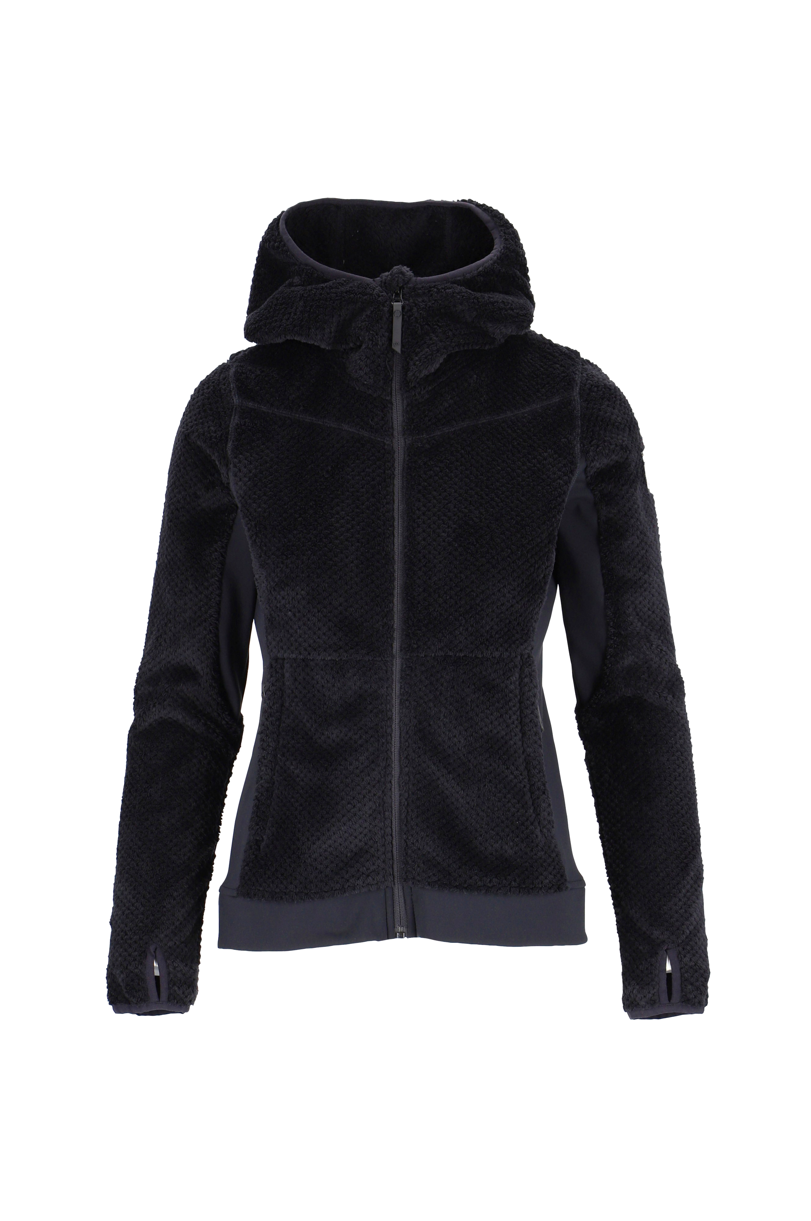 En sporty fleecejakke med hætte i blødt, børstet materiale. Sidepaneler og brystlomme i elastisk jerseymateriale.