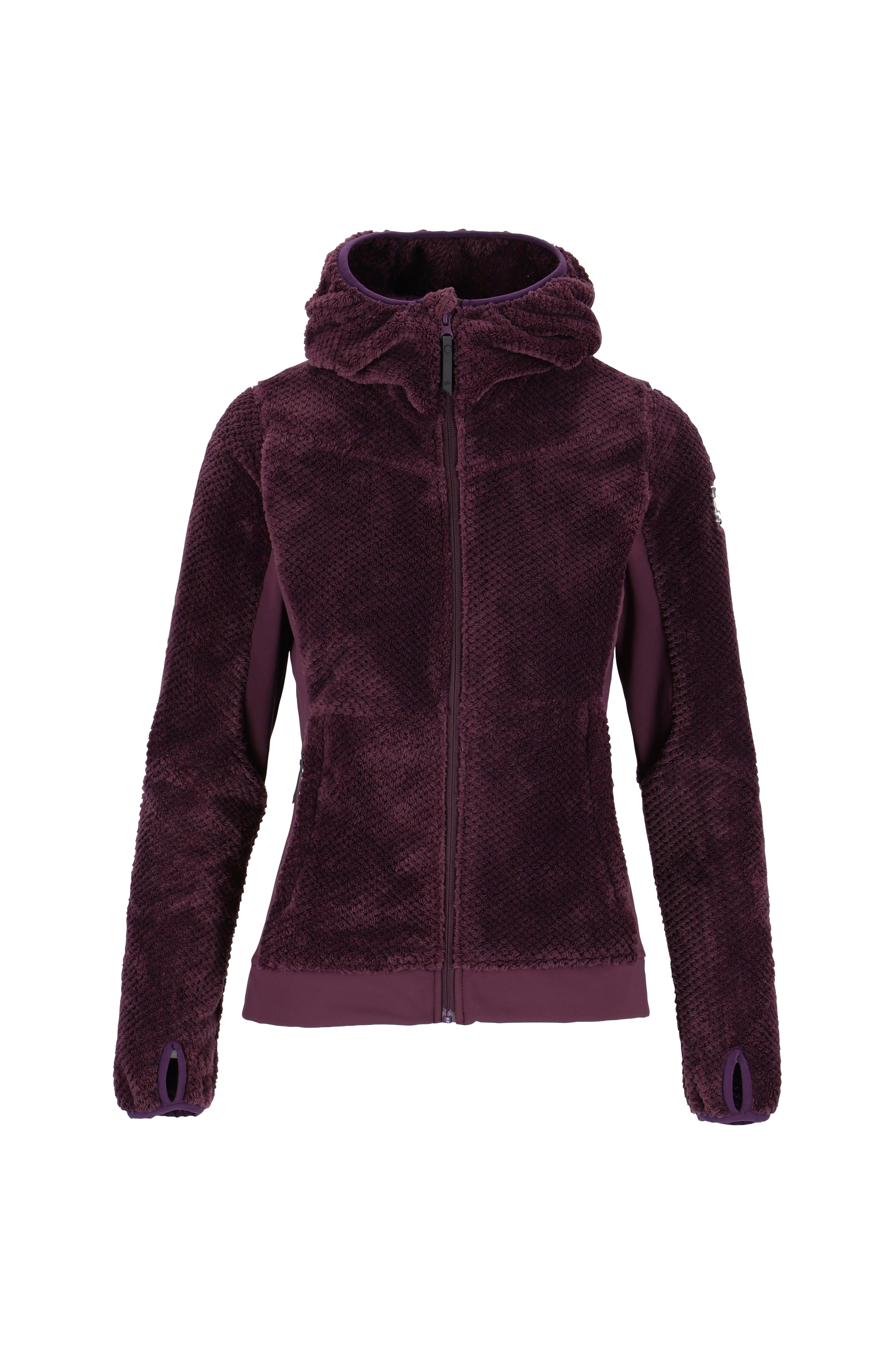 En sporty fleecejakke med hætte i blødt, børstet materiale. Sidepaneler og brystlomme i elastisk jerseymateriale.