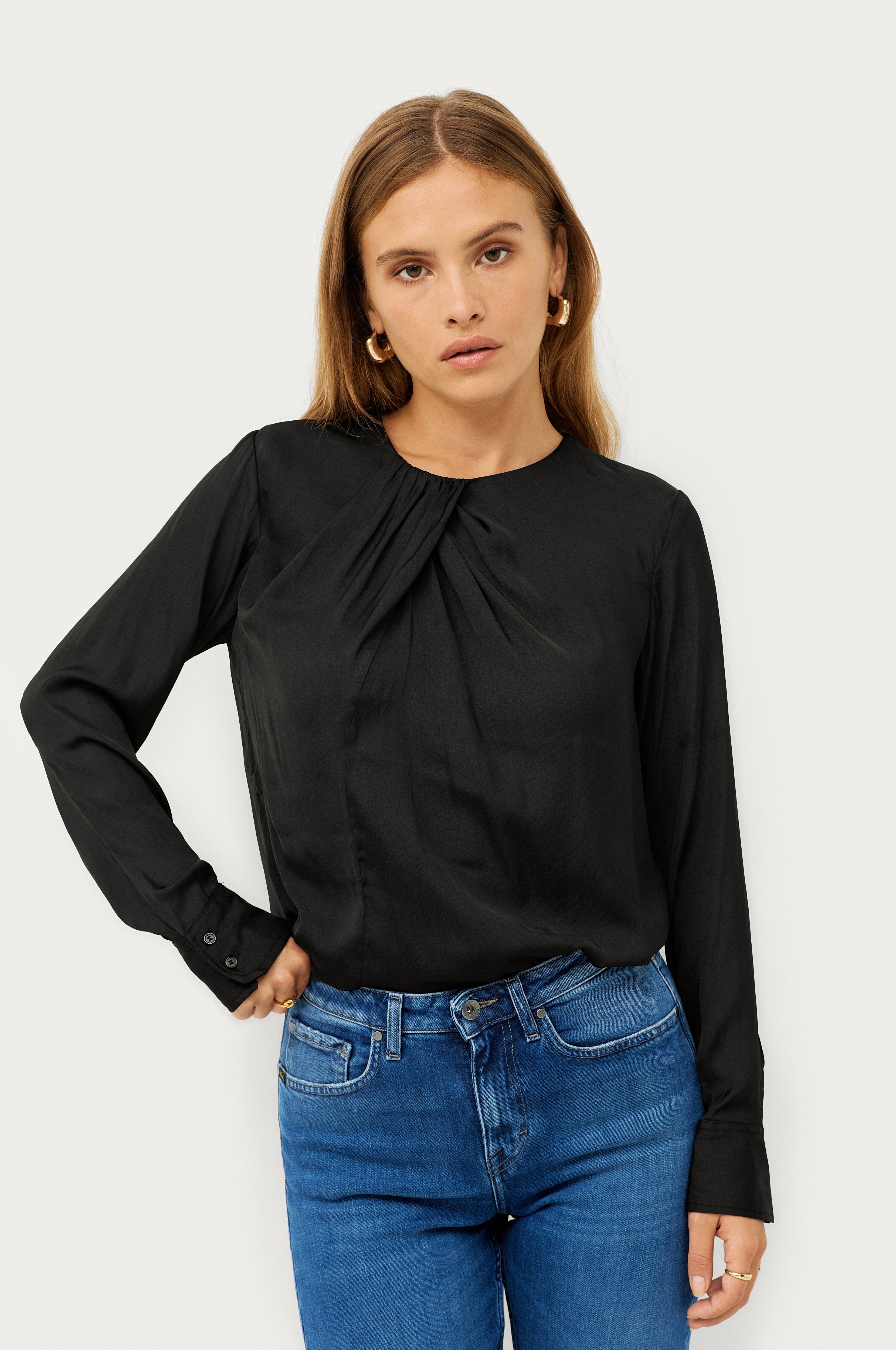 • Rund hals med rynket drapering foran • Ventilation med knap bagpå • Lange ærmer med manchet • Kvalitet med glans • Produktet indeholder genindvundet materiale, som genbruges for at reducere mængden af affald samtidigt med at der ikke anvendes nye ressourcer.