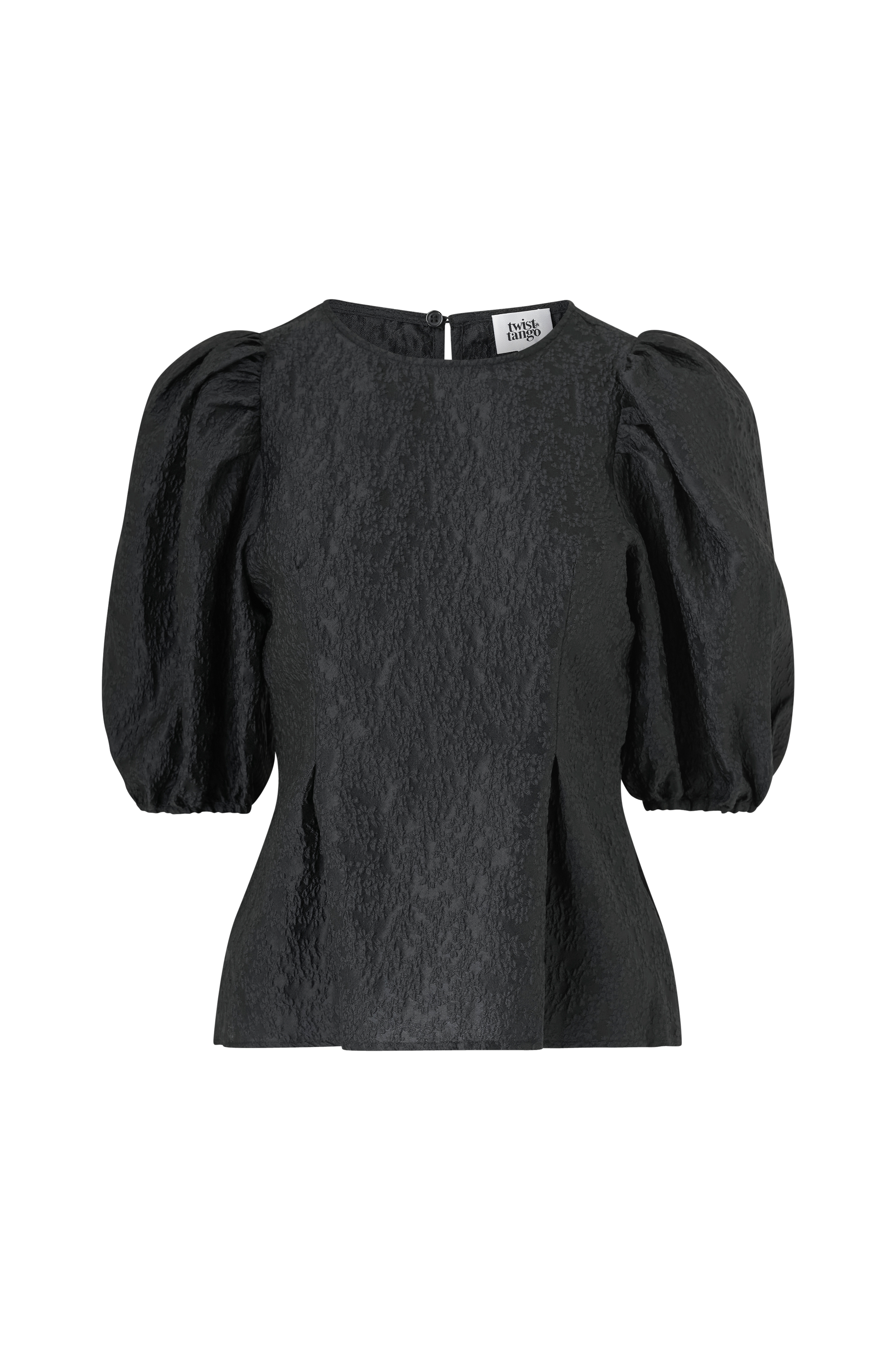 Ylja-blusen har korte pufærmer og en tætsiddende pasform, der fremhæver taljen og skaber en flatterende, feminin silhuet. Den detaljerede, mønstrede tekstur giver en sofistikeret fornemmelse og et stilfuldt look. Med sin skræddersyede form i taljen er den perfekt til et elegant og velklædt look.