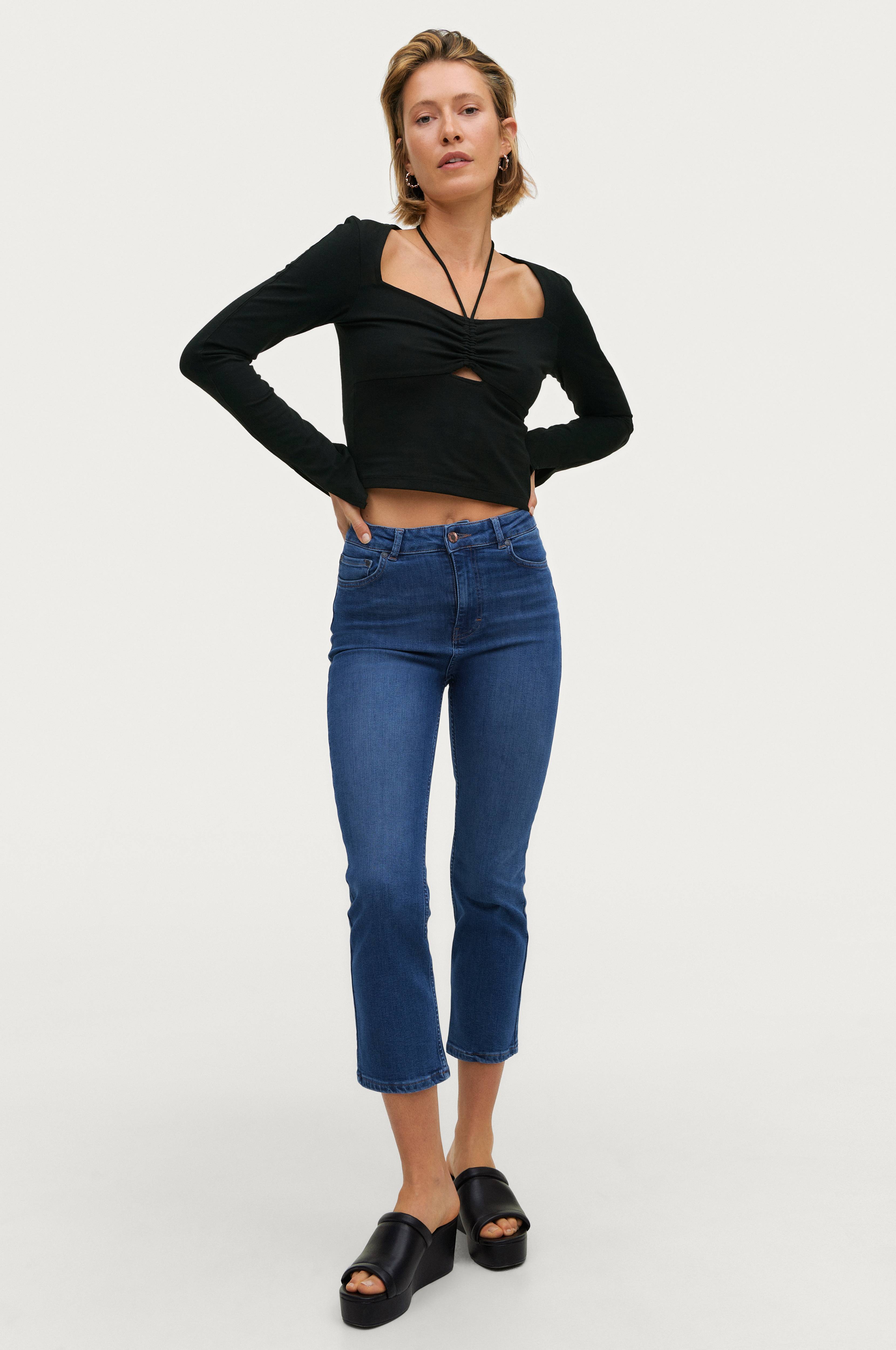 • Ankellængde • Skinny fit • Lige ben • Høj talje • Femlommemodel • Strækdenim • Gylp med lynlås • Produktet indeholder økologisk bomuld, som er dyrket uden kemiske sprøjtemidler, kunstgødning og genmodificerede afgrøder (GMO). Dette betyder et sundere arbejdsmiljø for landmænd og bedre jord.