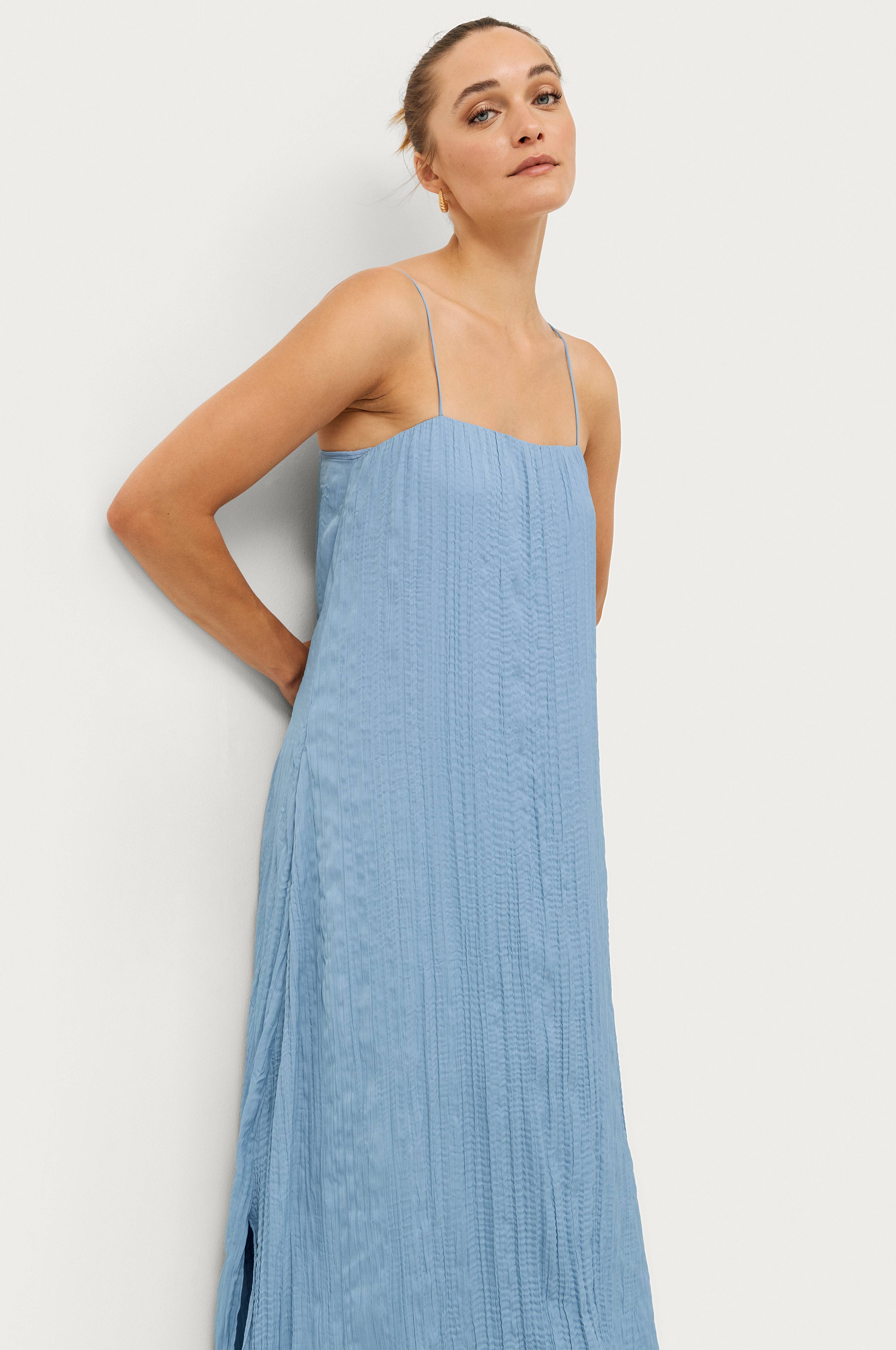 Hellang kjole med smalle skulderstropper. Lige udskæring både for og bag. Skjult lynlås i den ene side. Slids i siderne forneden. Fremstillet i blank kvalitet med strukturmønster. Tyndt for. Længde ca. 143 cm i str. 36.